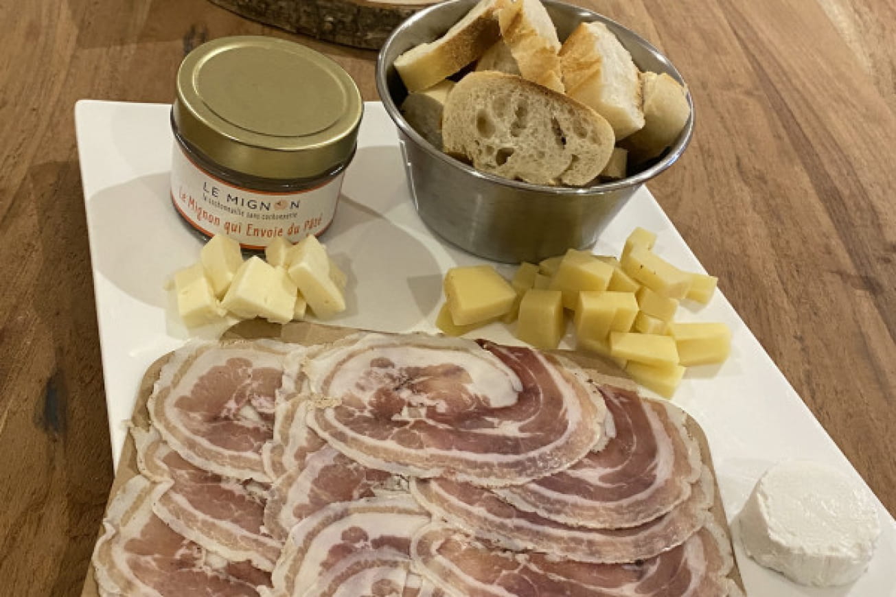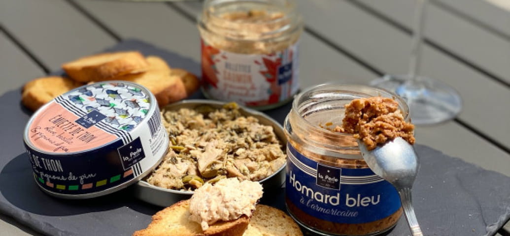 Die Tafel Meer besteht aus verschiedenen Terrinen und Rillettes auf der Grundlage von Fisch und Krustentieren, um die vorgeschlagenen Beilagen mit 2 Flöten Extra-Brut Fraîcheur de Coteau und einer Cuvée Rebelle zu diversifizieren.