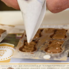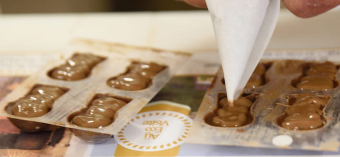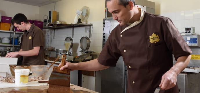 Bereiten Sie sich dann auf eine unvergleichliche süße Show vor! Beobachten Sie den Chocolatier, einen wahren Meister der Schokoladenkunst, bei der Herstellung der Spezialität des Hauses: des Champagnerlikörkorkens! Jede Geste, jede Bewegung wird dann die Geschicklichkeit und die Leidenschaft des Chocolatiers offenbaren und von einer Meisterschaft zeugen, die nur die Liebe zum Beruf einflößen kann.