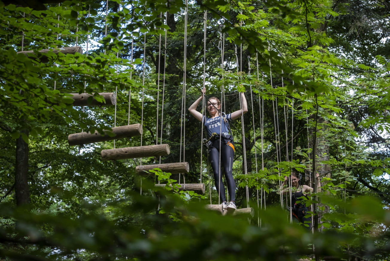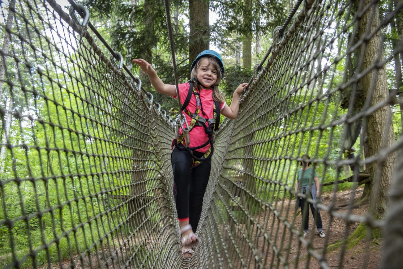 Hochseilgarten: 6 Schwierigkeitsstufen von grün bis superschwarz, die je nach Niveau ab 7 oder 12 Jahren zugänglich sind.