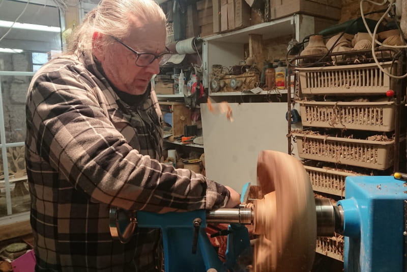 Die Hauptaktivität meiner Werkstatt ist die Herstellung von Holzobjekten, die mithilfe verschiedener Drechseltechniken gedrechselt werden (Drehen zwischen Spitzen, Drehen in der Luft, exzentrisches Drehen, dissoziiertes Drehen, ...). Ich biete außerdem das ganze Jahr über Kurse zur Entdeckung des Holzdrechselns an.