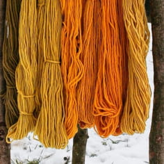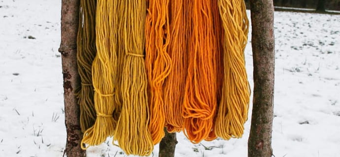 Weaving Maiden, Kunsthandwerkerin und Wollhändlerin, bietet mit Naalbinding hergestellte Kreationen, handgesponnene und pflanzengefärbte Garne sowie Workshops zur Entdeckung/Einführung in die Pflanzenfärbung, Naalbinding und das Spinnen an.