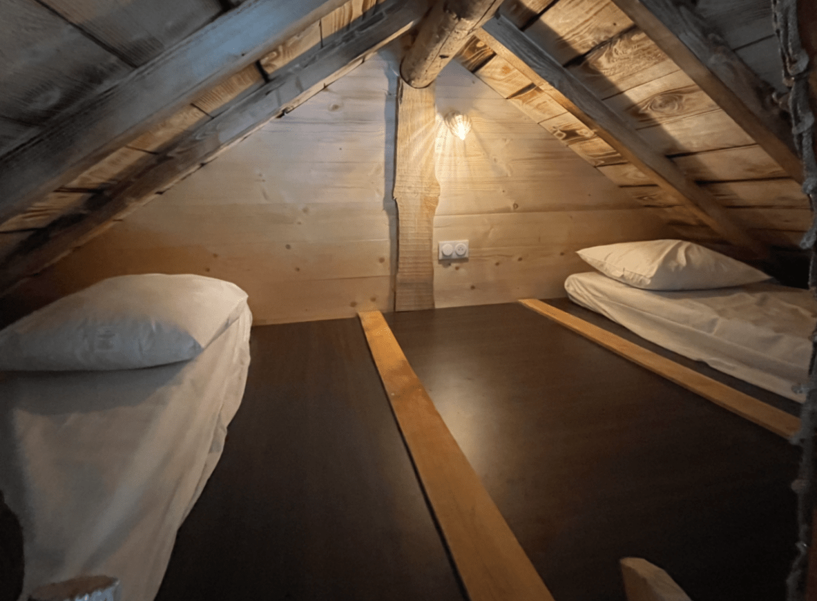 Zwischen Himmel und Erde schwebend, lassen Sie sich in einer gemütlichen und warmen Hütte vom Wind und den Vogelstimmen in den Schlaf wiegen. Die Unterkunft ist über eine Treppe erreichbar und bietet Platz für 4 Personen.