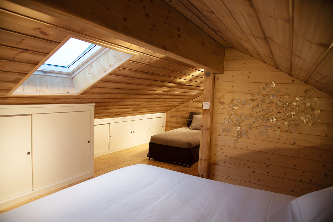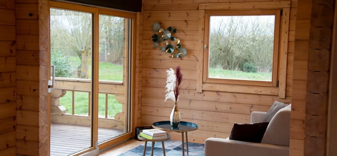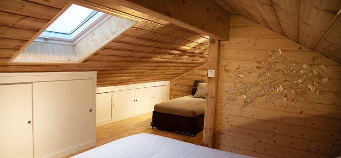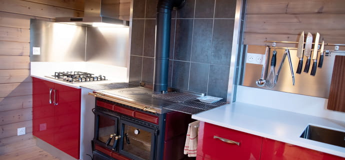 Schöne Leistungen erwarten Sie in einem Cottage aus Holz mit einem voll ausgestatteten Wohnbereich. Das ca. 50 m² große Cottage besteht aus einem Wohnraum mit einem 160 cm breiten Schlafsofa, einem Essbereich für bis zu 8 Personen und einer voll ausgestatteten Küche mit Holzherd, Gasherd, Mikrowelle und allen nützlichen Elektrogeräten zum Kochen. Im Erdgeschoss befindet sich außerdem das Badezimmer mit einem Duschmodul aus Corian und seinem Regenhimmel. Am oberen Ende der Treppe befindet sich das Zwischengeschoss mit einem 180 cm breiten Doppelbett und einem Ausziehbett für zwei Kinder.