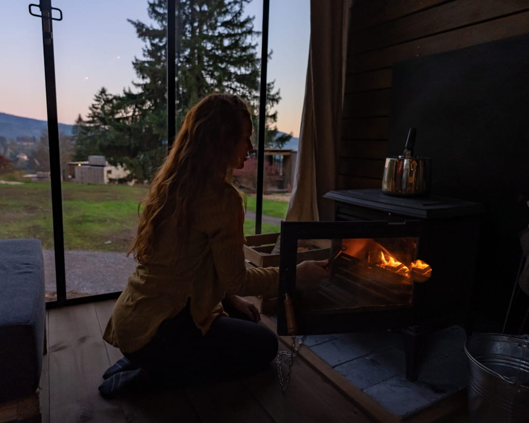 Alle Hütten sind mit einem Holzofen ausgestattet und verfügen über große Stahlfenster, die einen atemberaubenden Blick auf die umliegende Landschaft bieten. Ihnen stehen große, bequeme Betten, ein Sofa, eine voll ausgestattete Küchenzeile, eine Terrasse mit Möbeln und Grill sowie ein Badezimmer zur Verfügung. Für Ihren Komfort stehen Kerzen, Öllampen und dicke Decken bereit – perfekt für einen gemütlichen Abend.