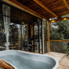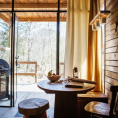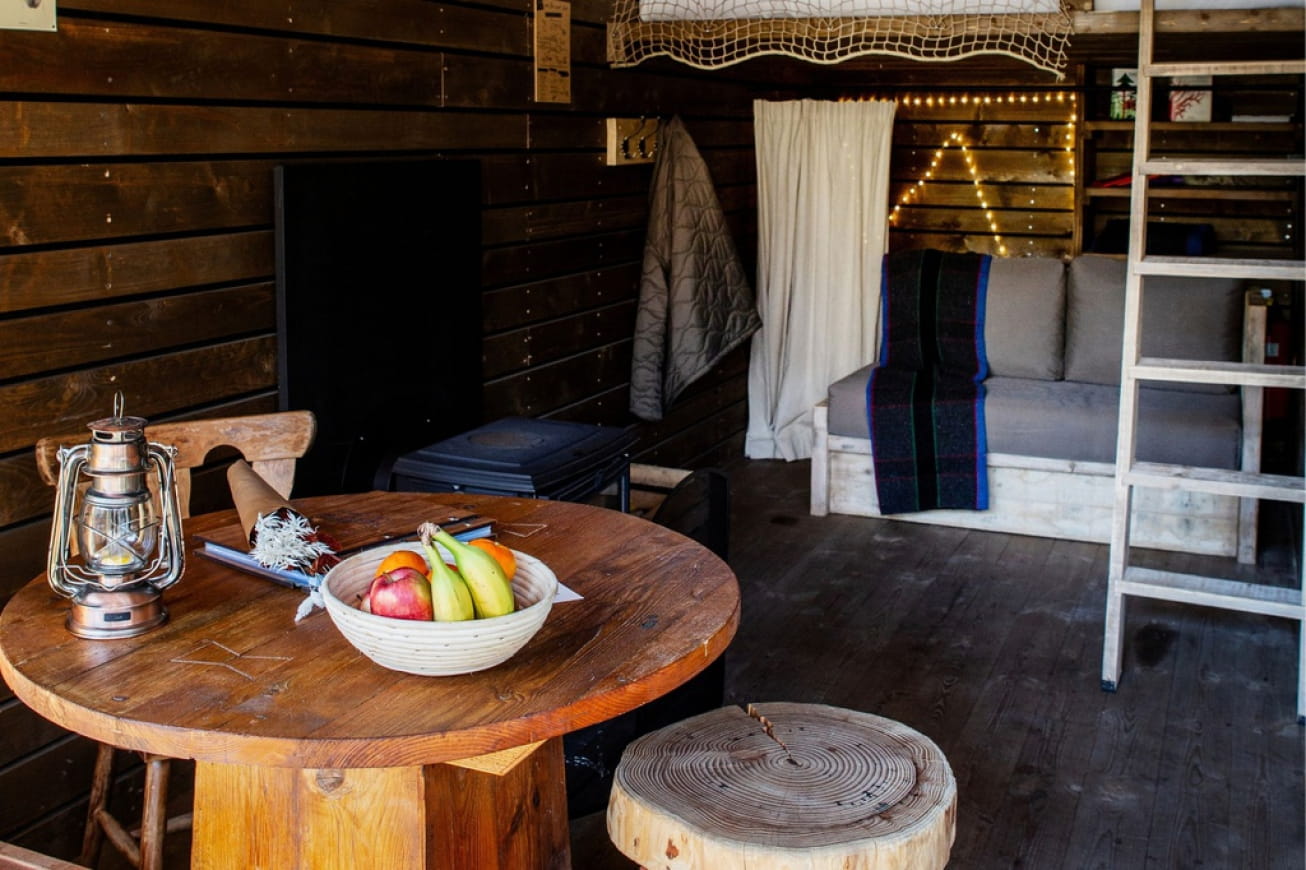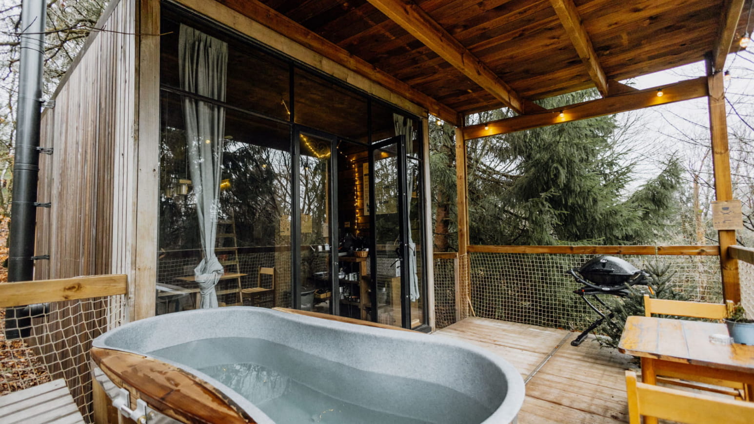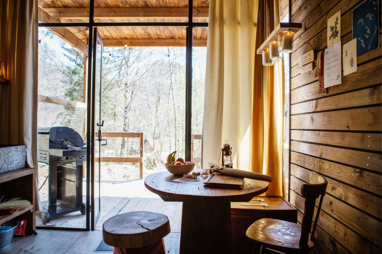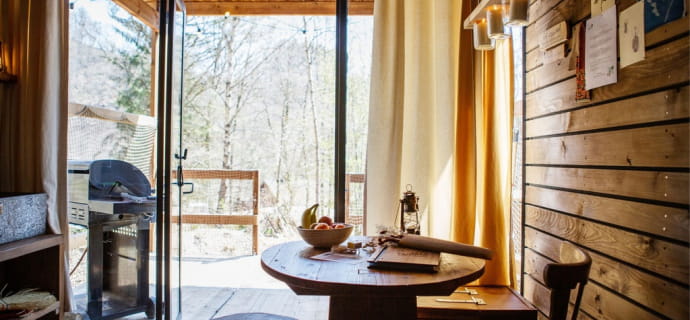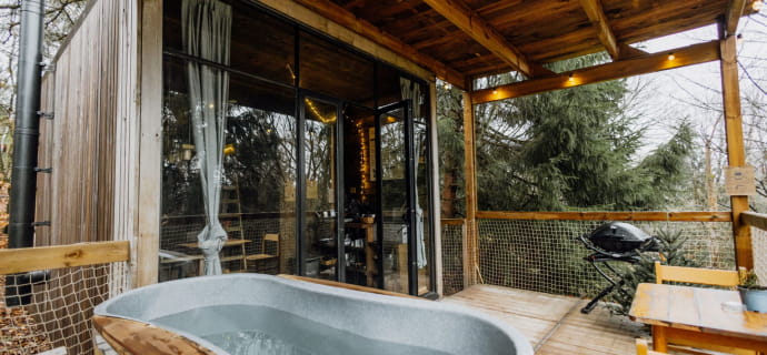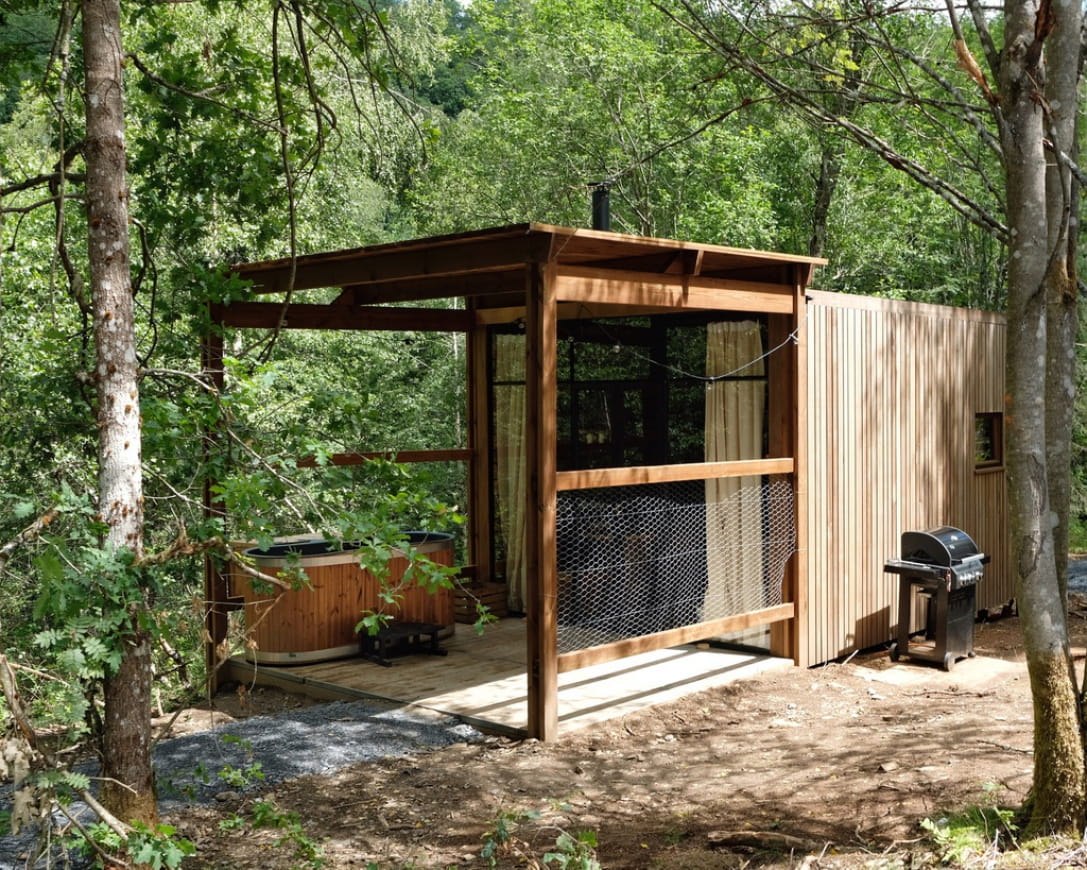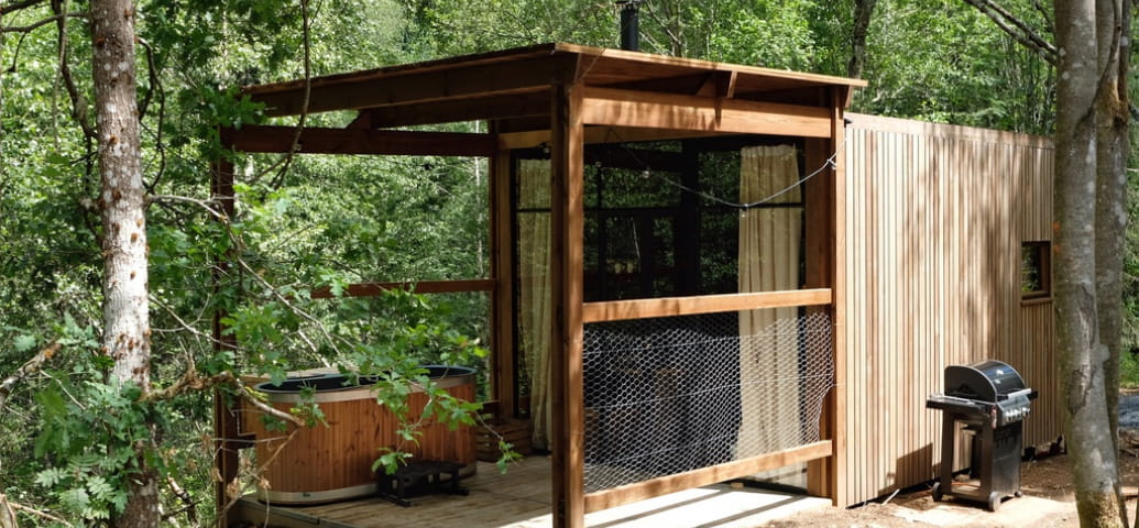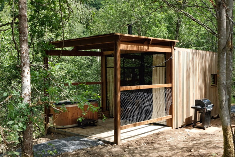 Im Inneren verfügen Sie insbesondere über ein Doppelbett (180 x 200 cm), eine Warmwasserdusche mit Toilette, eine Entspannungsecke mit Tisch und kleinem Wohnzimmer sowie eine ausgestattete Küche und einen Grill für Ihre Feinschmeckermomente. Ein Holzofen ist ebenfalls vorhanden, damit Sie sich abends aufwärmen können. Und das Sahnehäubchen auf dem Kuchen ist das nordische Bad auf der Terrasse, einfach perfekt, um sich naturnah zu entspannen.