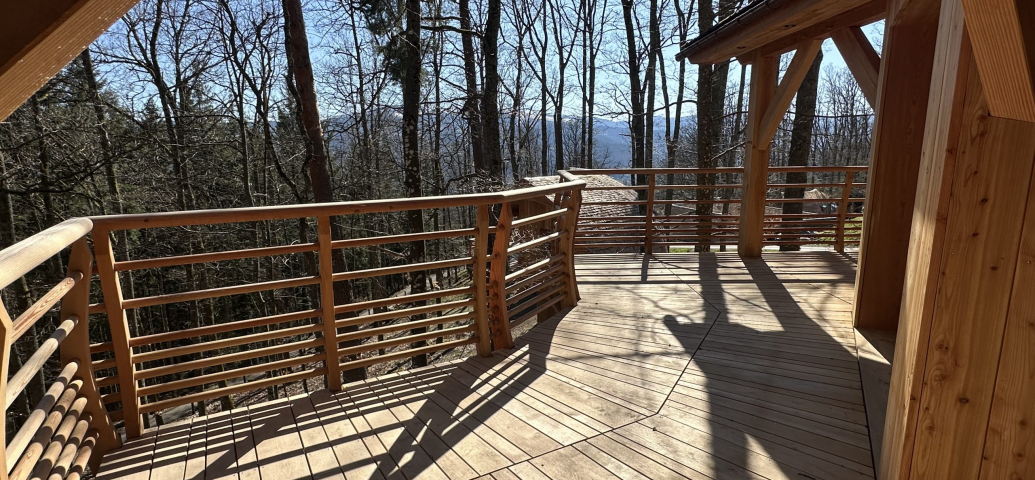 - Hoch gelegene Hütte mit Panoramablick auf das Tal und die umliegenden Wälder.