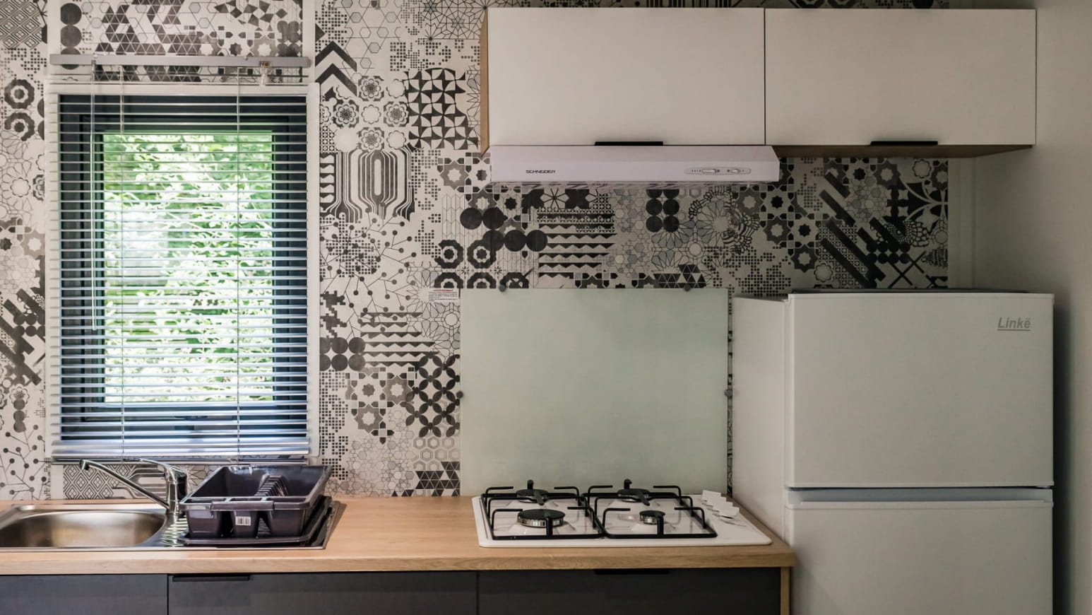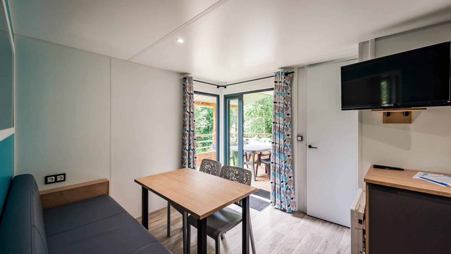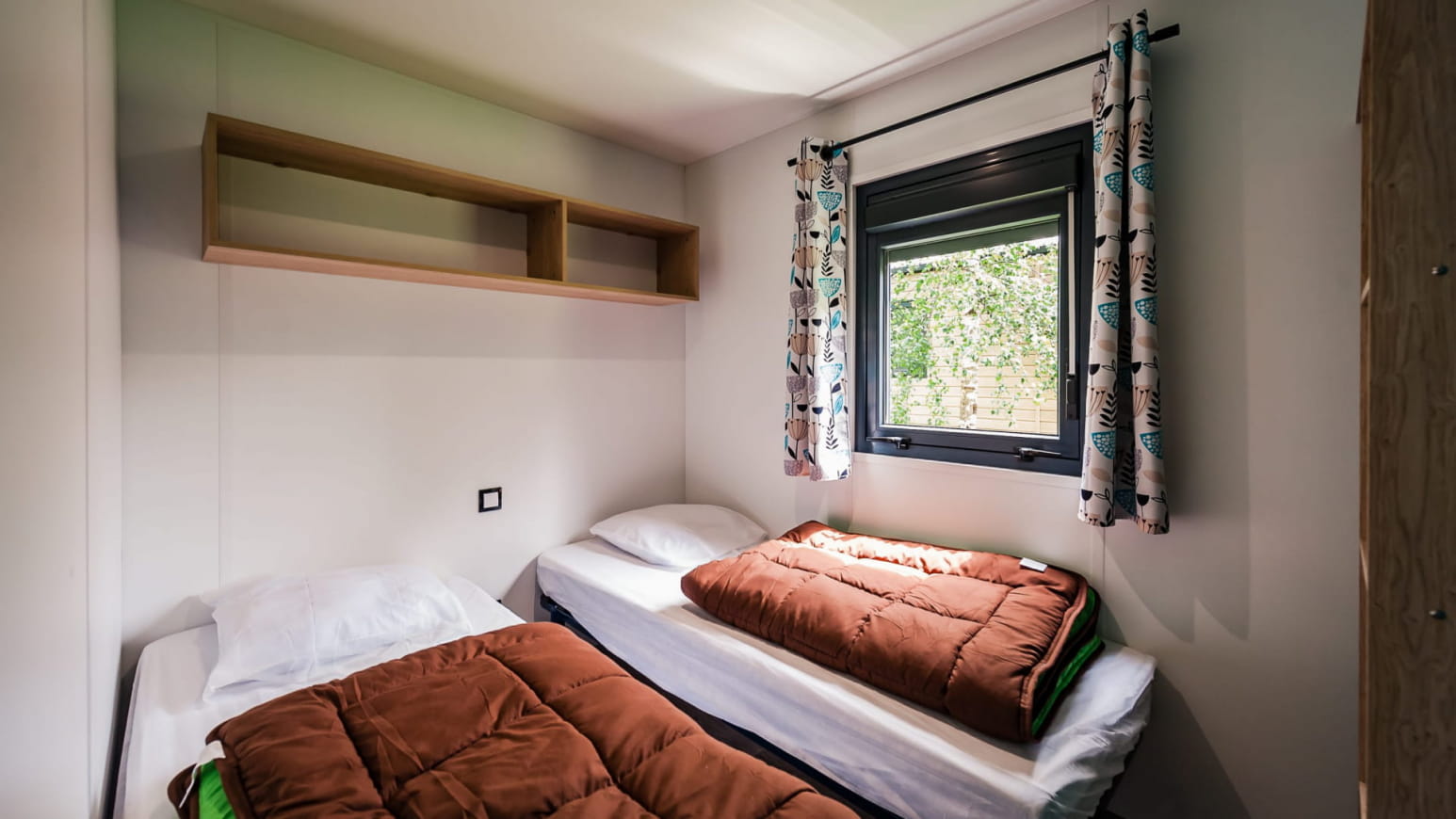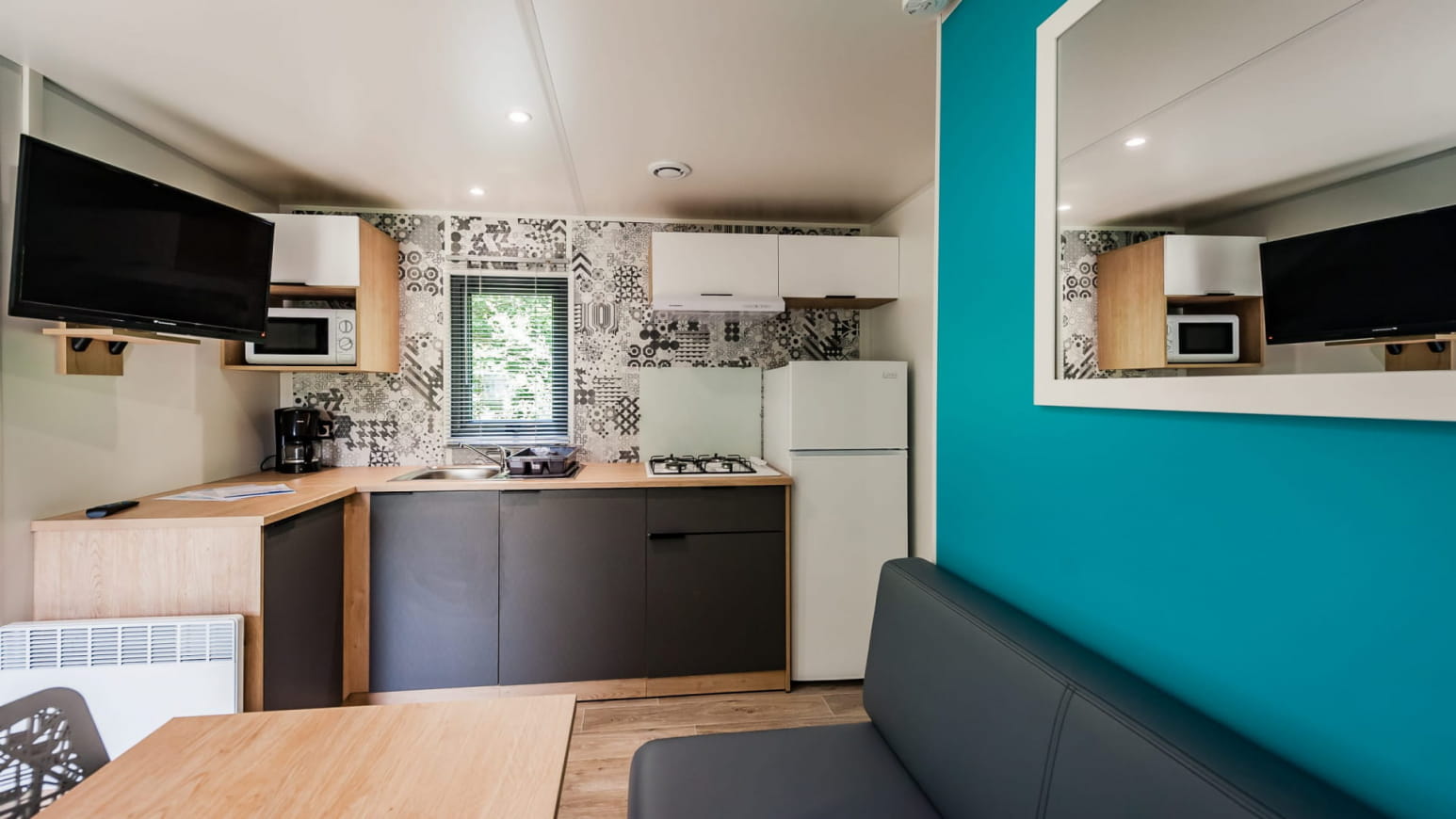 Das sichere und funktionale Mobil Home Premium Komfort mit 2 Schlafzimmern kann bis zu 4 Personen beherbergen. Es ist alles vorhanden, damit Sie Ihren Urlaub unter guten Bedingungen verbringen können. Das bedeutet eine voll ausgestattete Küche, geräumige Wohnbereiche, bequeme Sitzgelegenheiten, Heizmaterial und eigene Toiletten.