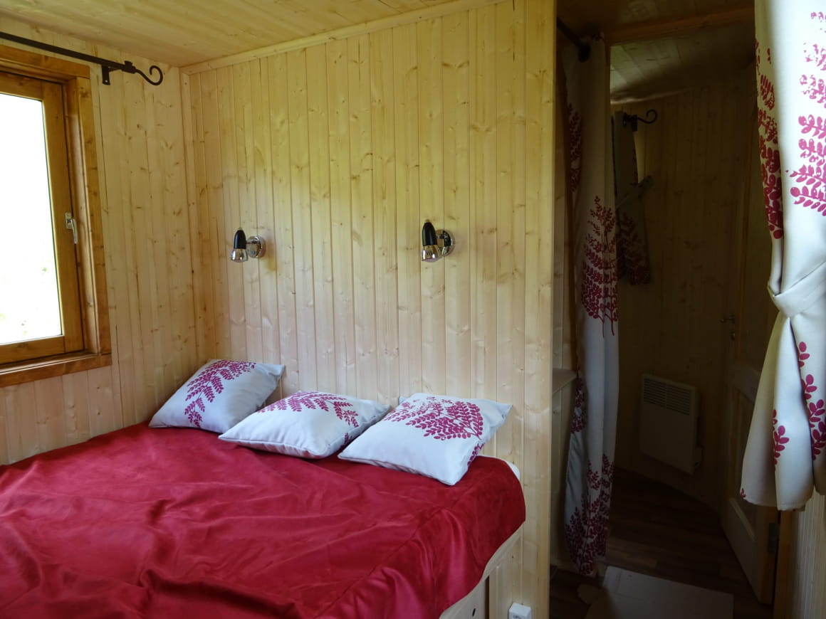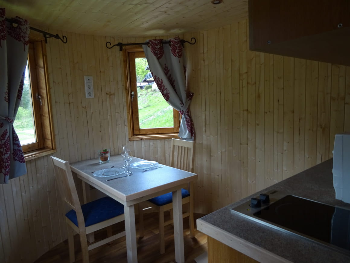 Im Inneren seiner ungewöhnlichen Struktur bietet es einen Schlafbereich mit einem Standard-Doppelbett und Verdunkelungsvorhängen. Dieser führt direkt in einen Wohnbereich mit einer Essecke mit Blick auf die grüne Landschaft und einer Küche, die mit Kühlschrank, Mikrowelle, Glaskeramikkochfeld, Kaffeemaschine und Wasserkocher ausgestattet ist. Darüber hinaus verfügt es über ein modernes Badezimmer mit Duschkabine und Toilette.