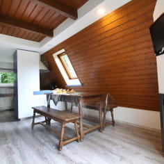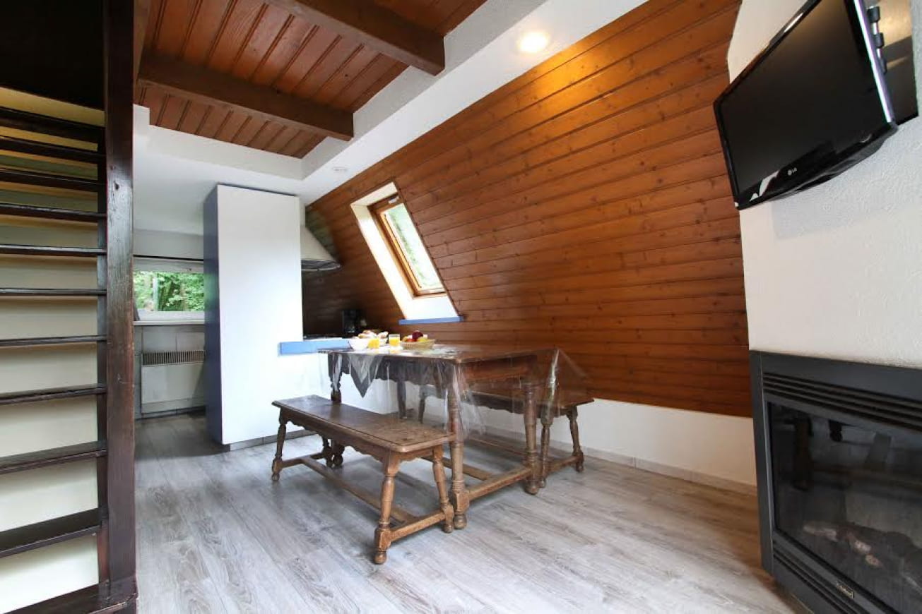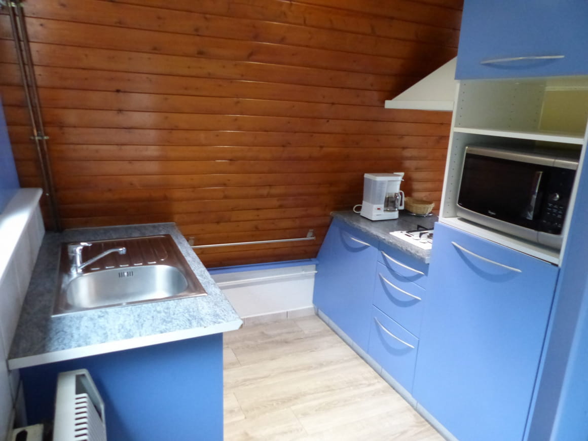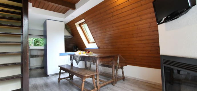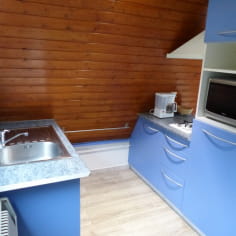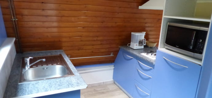 Das Chalet ist perfekt ausgestattet, damit Sie sich zu jeder Jahreszeit wohlfühlen. Ein elektrischer Kamin sorgt für eine gemütliche Atmosphäre im Wohnbereich, der aus einer ausgestatteten Küche, einer Essecke und einem Schlafsofa für 2 Personen besteht. Die sanitären Anlagen befinden sich auf der gleichen Ebene. Das Chalet verfügt über 3 Schlafplätze, darunter ein Twin-Zimmer im Dachgeschoss und zwei Doppelzimmer mit jeweils einem Standardbett.