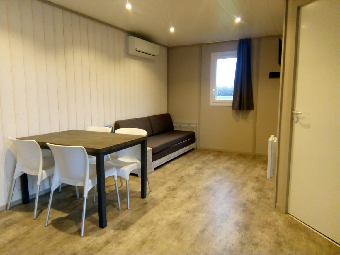 Das Chalet kann 2 bis 4 Personen beherbergen und ist komplett ausgestattet. Sie finden dort ein Schlafzimmer mit einem Doppelbett, einen Wohnraum mit einer eingerichteten Küche, ein Wohnzimmer mit einem ausziehbaren Schlafsofa sowie einen Esstisch. Das Badezimmer und die Toilette, die in einem geräumigen Raum zusammengefasst sind, sind für Personen mit eingeschränkter Mobilität geeignet und bieten eine praktische und barrierefreie Einrichtung.