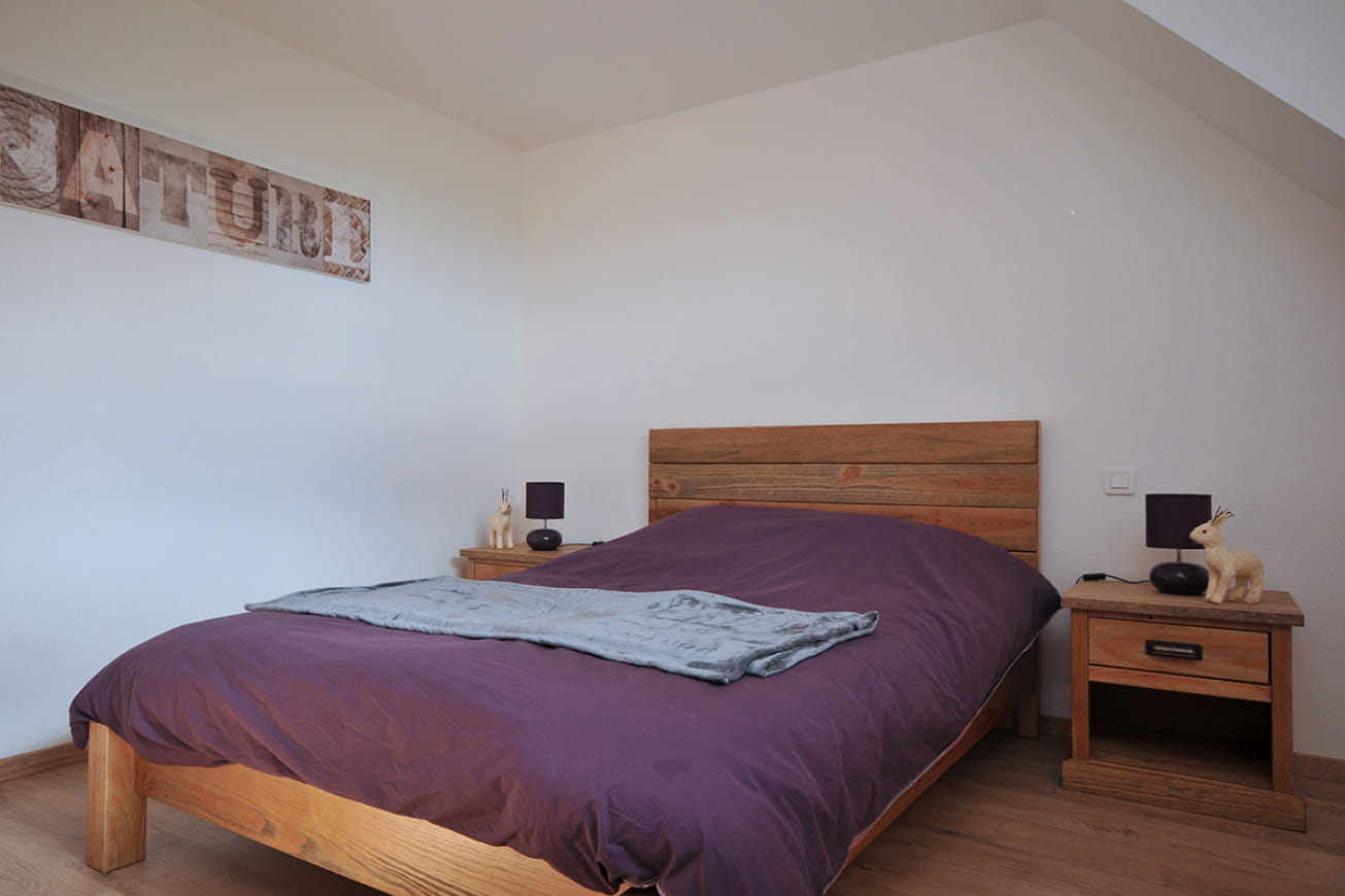 Schlafzimmer auf der zweiten Ebene über eine Wendeltreppe 2 Betten 90×190, Ankleidezimmer. Sehr helles und ruhiges Ferienhaus mit herrlichem Blick auf die Vogesen und den Schwarzwald, in der Nähe aller Annehmlichkeiten (Bäckerei im Dorf und Supermarkt in 5 Minuten Entfernung).