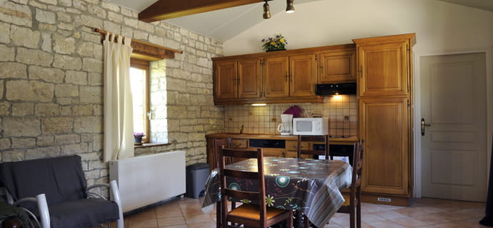 Großes Esszimmer/Küche, Badezimmer, WC. Ein Schlafzimmer (1 Doppelbett), ein Schlafzimmer (2 Einzelbetten). Bettwäsche wird gestellt und Nebenkosten sind im Preis inbegriffen. Aufpreis ab 2 Haustieren.