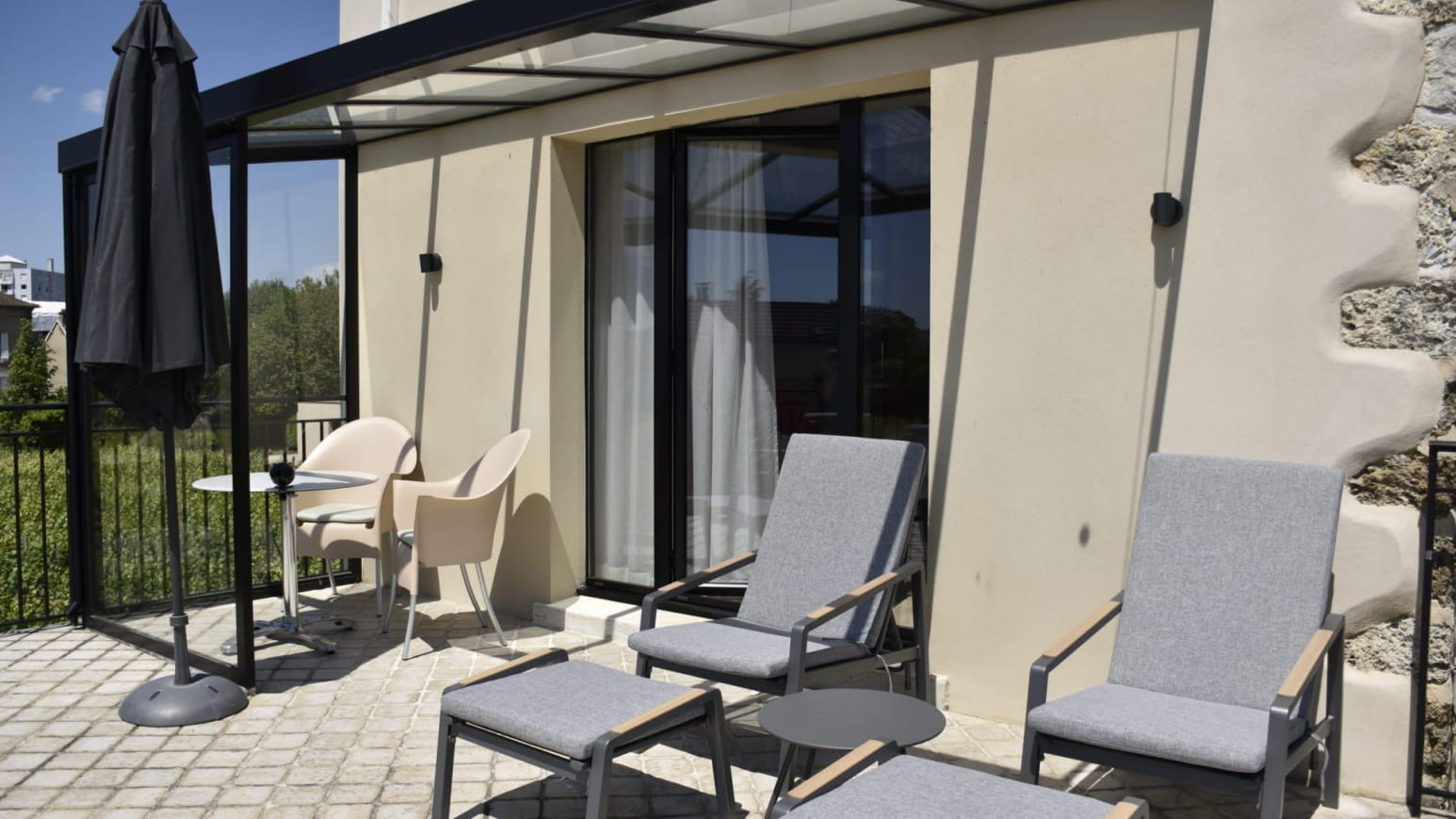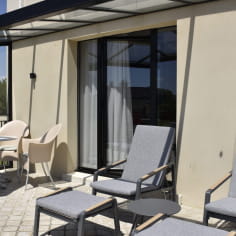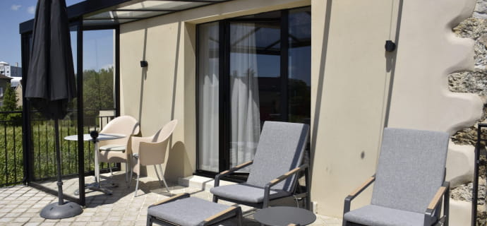 Die Golden Suite, ein luxuriöses Zimmer mit charmantem Dekor, empfängt Sie in einem erhabenen Rahmen im Herzen dieses Herrenhauses aus dem 19. Die ausgewählten Farbtöne, die gepflegte Dekoration, die luxuriösen Möbel und nicht zuletzt die große Terrasse mit Blick auf den Garten und die Weinberge machen die Golden Suite zur idealen Unterkunft für Ihre gehobene Auszeit auf der Domaine.