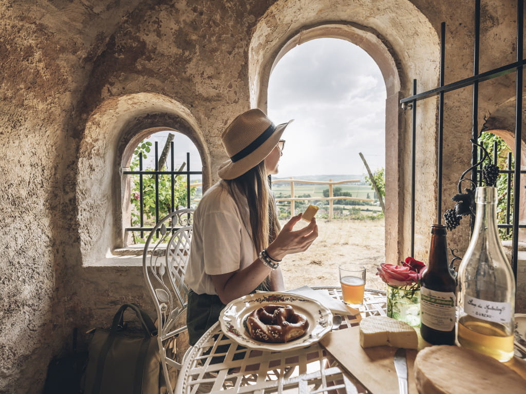 Um unseren ersten Tag auf der Elsässischen Weinstraße abzuschließen, stellen wir unser Gepäck in Marlenheim ab. Um die Beine auszuruhen und den Geist zu lüften, gibt es nichts Besseres als eine gemütliche Unterkunft! Sie richten sich in einem typisch elsässischen Gebäude ein, in dem Gastfreundschaft und die Kunst des guten Lebens gepflegt werden. Nach einer erholsamen Nacht frühstücken wir auf der Terrasse mit den grünen Weinbergen im Hintergrund. Egal, von wo aus man sie bewundert, sie sind immer gleich schön!