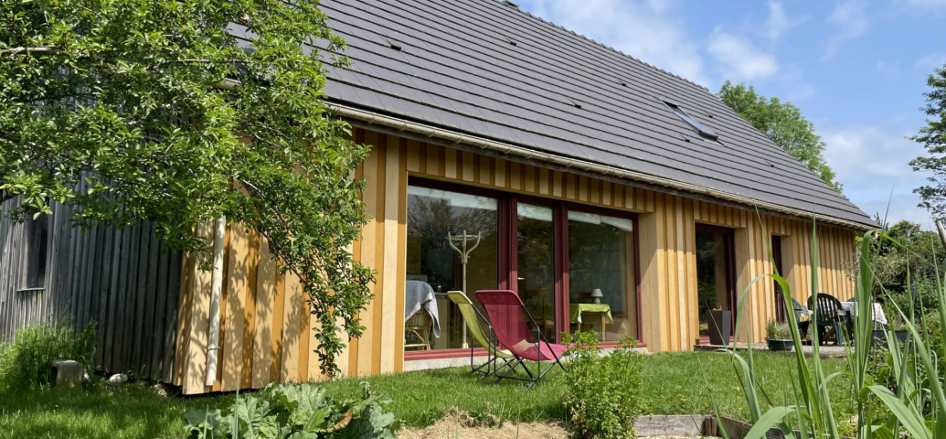 Nestled in a green pasture, the house is surrounded by magnificent natural scenery. The outside offers fresh air and space, while the inside lulls you into a warm, Zen atmosphere. Pick vegetables from the garden, fruit from the orchard and eggs from the henhouse. While your dishes simmer on the fire, the kitchen offers a superb view of the garden.