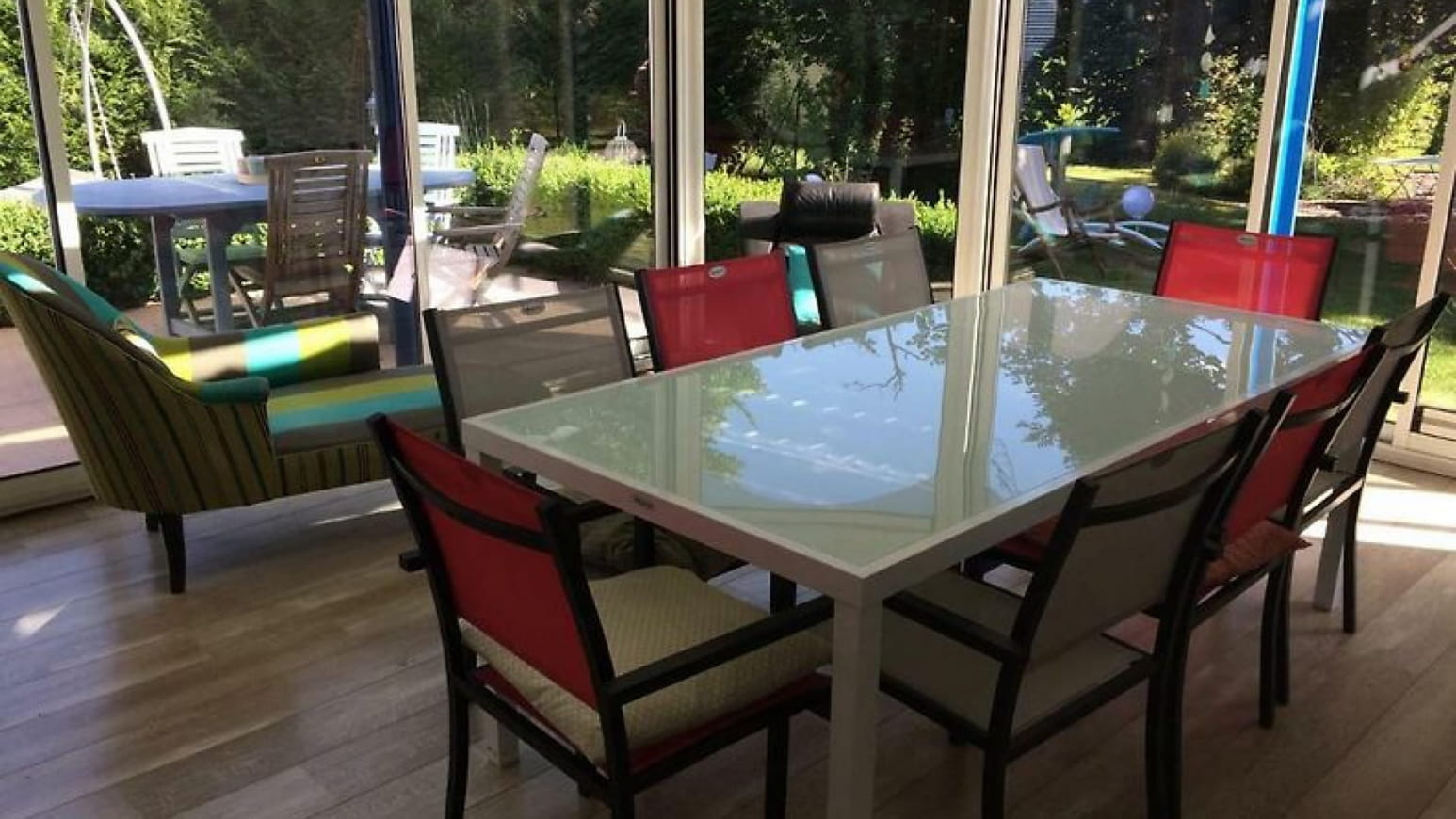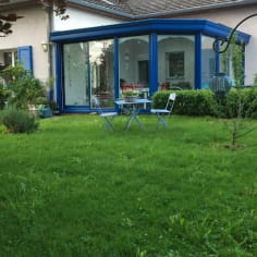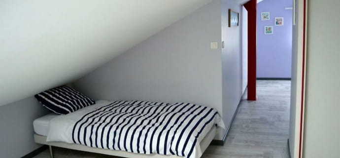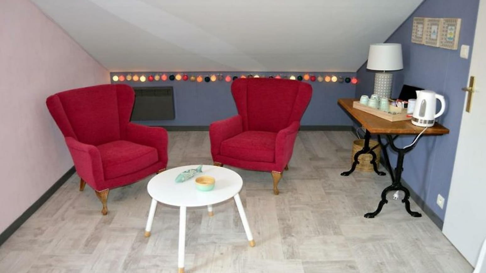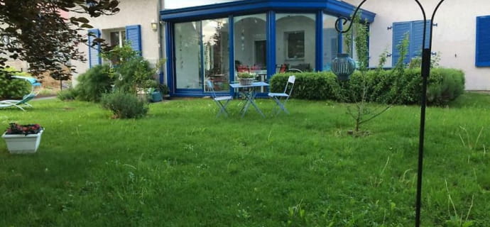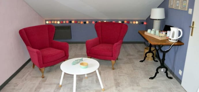 This family suite for 4 persons occupies the whole floor of the house (70m²) and includes a bedroom with 1 bed 140×200, a bedroom with 2 beds 90×190, a bathroom with separate toilet, a living room, a desk, a refrigerator. Breakfast is served under the veranda with a view on the calm and flowery garden. You can taste home-made jams (mirabelle plums, raspberries, strawberries, apricots). The good’étage proposes the table d’hôtes with a kitchen based on regional products on reservation.