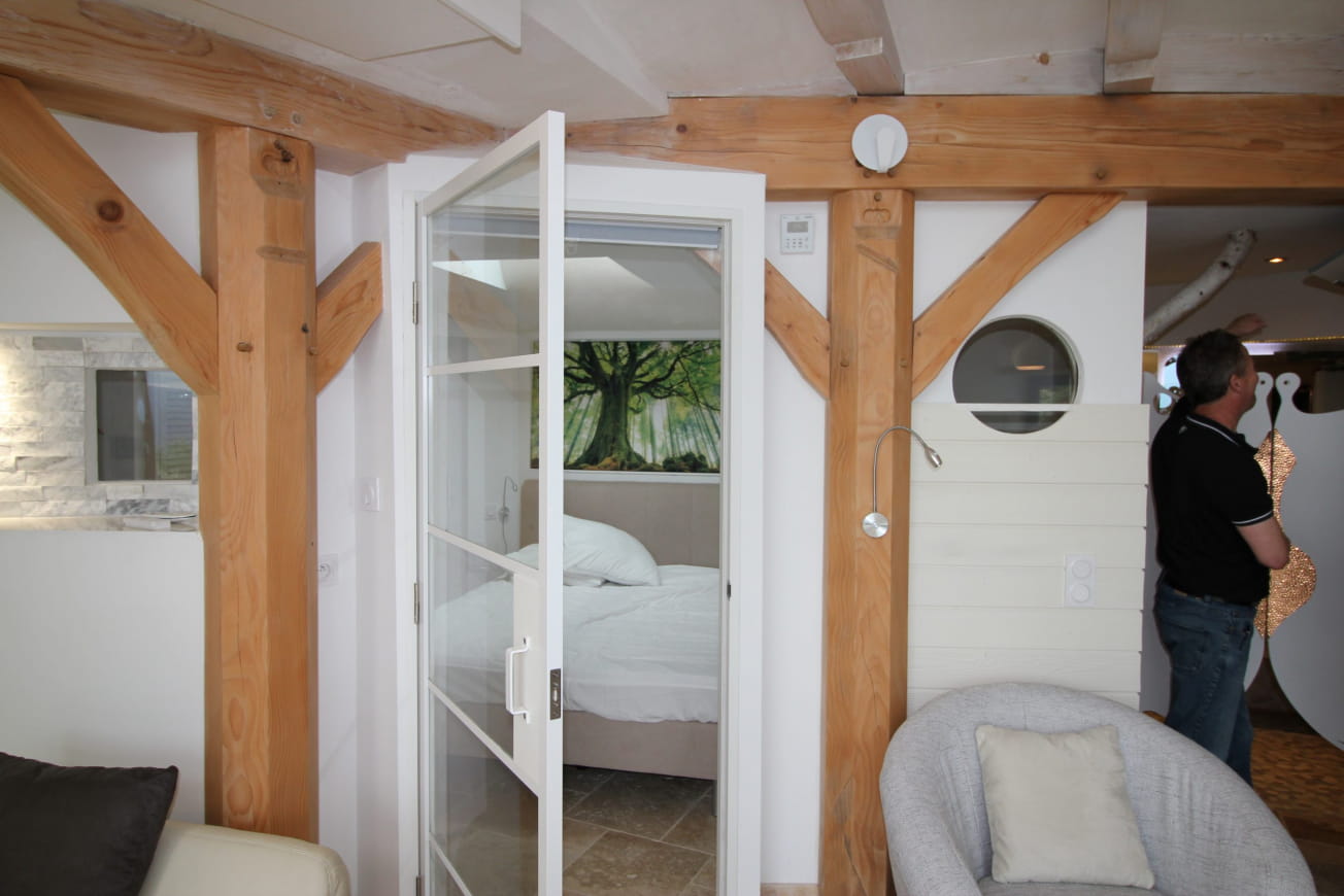 Inside, you'll be captivated by the beauty of the fully folding glass façade. Be at the heart of the action with this luxury gîte, featuring 2 bedrooms with double beds in "boxspring" style, 4-star comfort, and a bedroom illuminated by a motorized dome for sweet dreams under the stars.