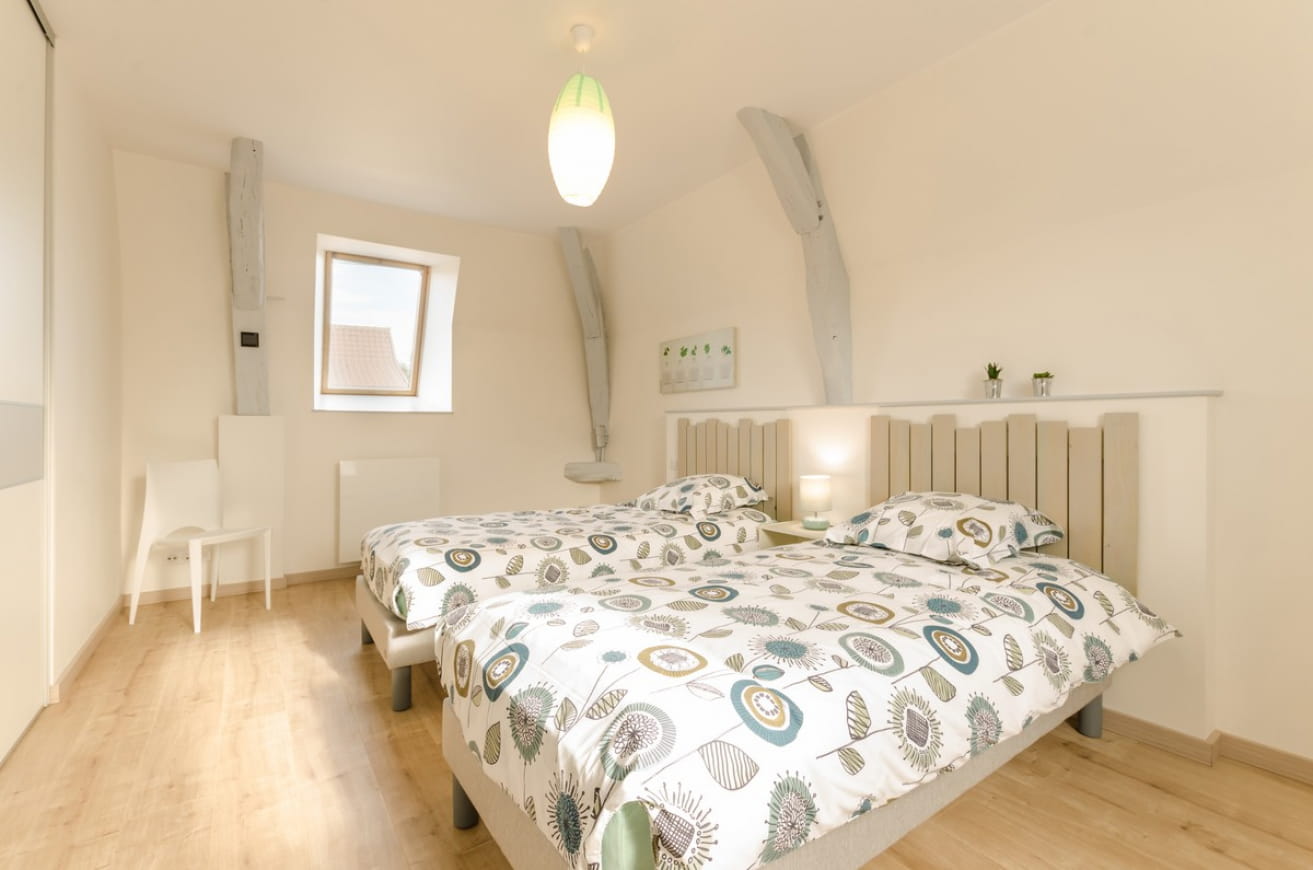 Outside, you’ll find an unfenced parking area at the front of the house, as well as a 70 m2 enclosed gravel courtyard (at the rear of the house) with terrace, garden furniture, barbecue, deckchairs and parasol. Geothermal heating, electricity, bed linen and household linen (tea towels, tablecloths, napkins) are included in the price of your stay.