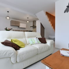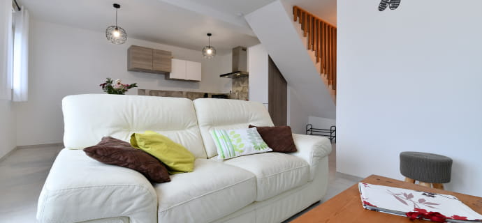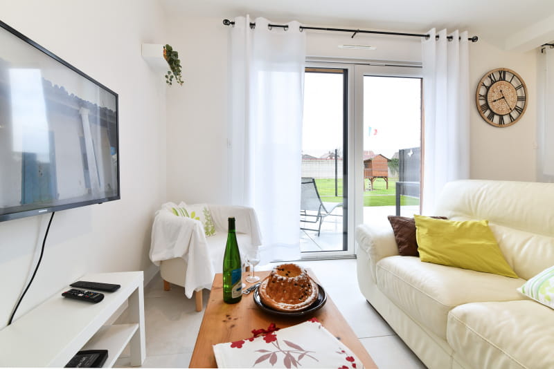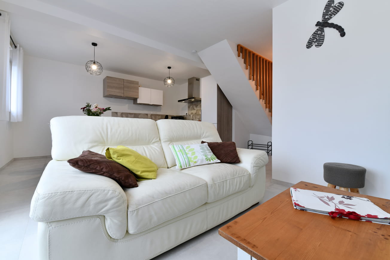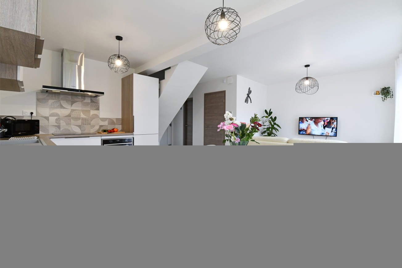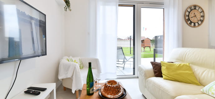 With a surface area of 70m², the gîte de la Batteuse welcomes you in a bright, uncluttered setting. On the first floor, you’ll enjoy a large 30m² living room, comprising a lounge area, a dining area and an open, fully-equipped kitchen. With direct access to the terrace and private garden, this living space is ideal for having breakfast and sharing warm moments with family or friends!