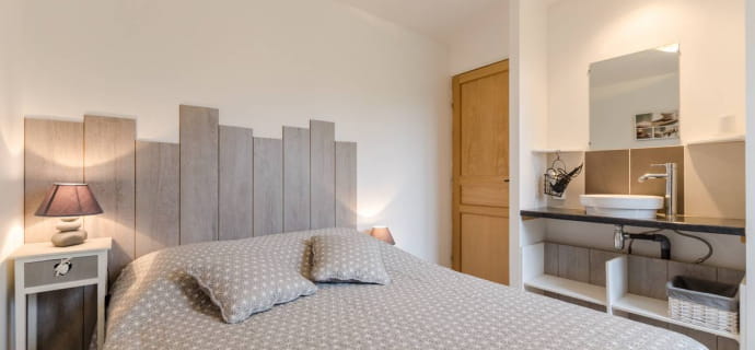 The gîte is housed in a typical two-storey house spanning 232 m2. Sleeping up to 14 people, it’s ideal for family vacations. Entirely maintained by electric heating, it preserves a warm and pleasant atmosphere. On the first floor, a fully equipped kitchen opens onto a spacious living room with bar chairs, lounge and large dining table. On the same level are 2 bathrooms with Italian shower and separate toilet.