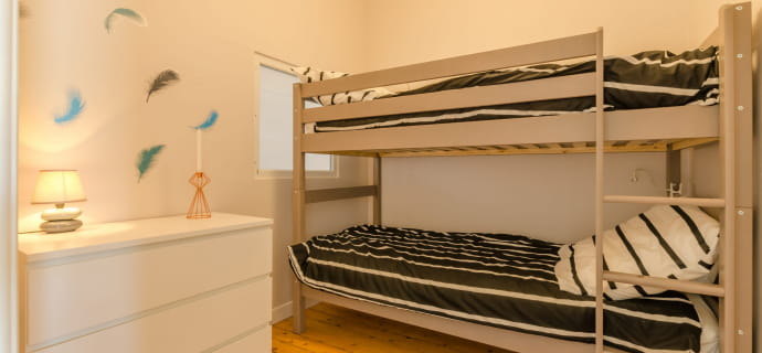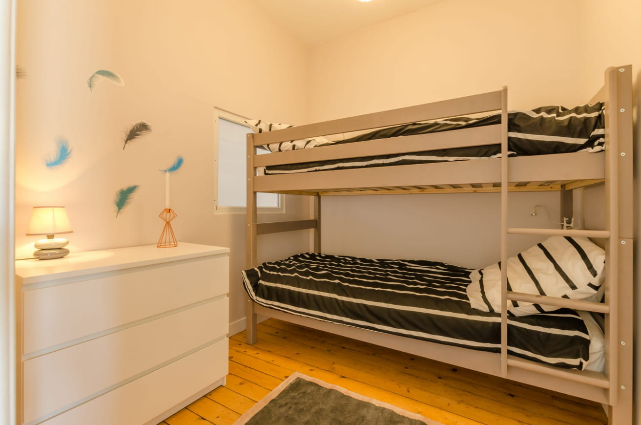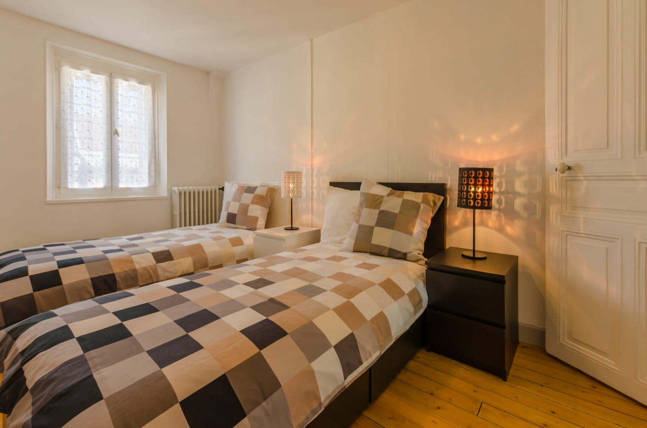 The apartment features a spacious living room with sitting area, dining area and fully-equipped kitchen. An old spiral staircase leads to a bedroom with 2 single beds (90×200), a sleeping area with 2 bunk beds (90×190) and a bathroom (shower, washbasin, toilet, heated towel rail). Beds will be made up on arrival, and linen (tea towels, tablecloths, napkins), heating and electricity are included in the price of your stay. Free parking 50 meters away.