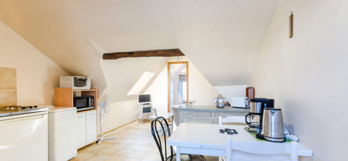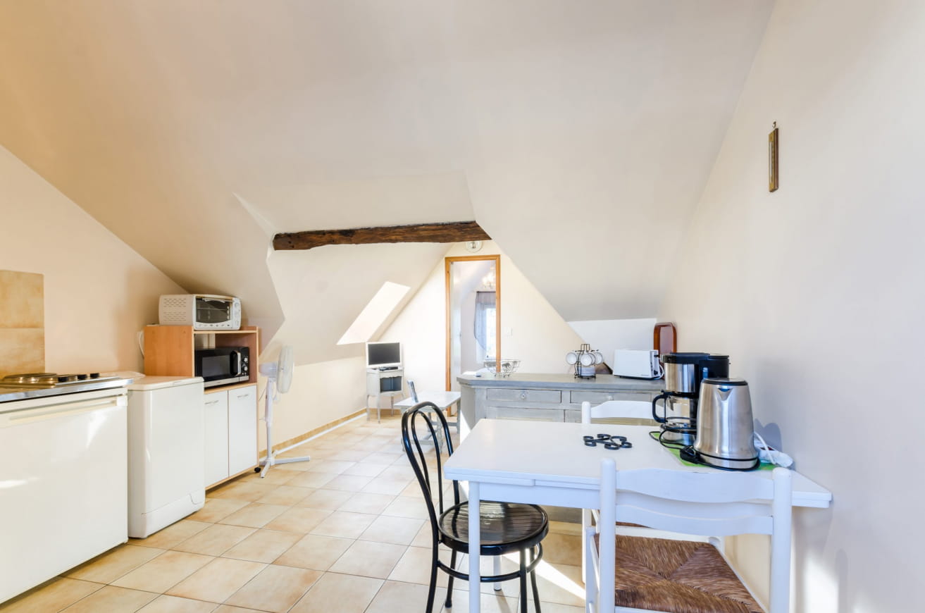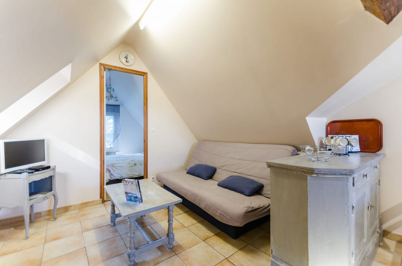 Are you looking for a quiet yet comfortable place to stay? Le Beauregard has been designed to please travelers in search of tranquility. Its immaculate white walls are a natural invitation to peace and serenity. This charming apartment is located on the first floor of an annex to the owners’ house. It features a bright living room with a fully-equipped kitchenette, a sitting area with a sofa bed, a dining table and a TV.