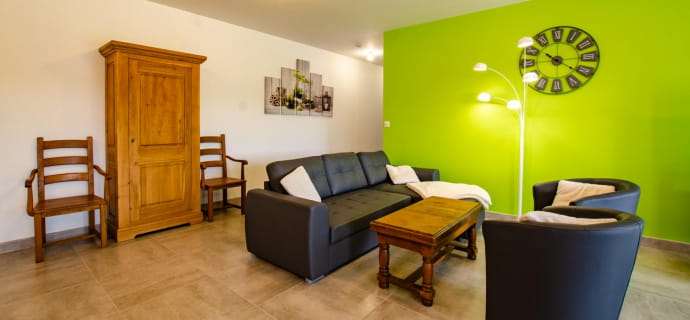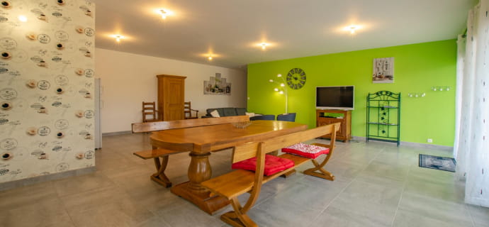 The gite features a large living room opening onto the outside and comprising a fully-equipped kitchenette, a dining area, a lounge with TV and DVD player, a sofa bed, a separate toilet with washbasin, a bathroom with shower and a toilet.separate toilet with washbasin, 2 double bedrooms (160×200 beds), a twin bedroom (2 90×200 beds) and a shower room with extra-flat shower tray, washbasin and toilet. Outside, you’ll enjoy a 100 m² terrace overlooking the countryside, with garden furniture, deckchairs, parasol, barbecue, grassy areas planted with trees and a children’s swing, volleyball/badminton/football court and petanque area.