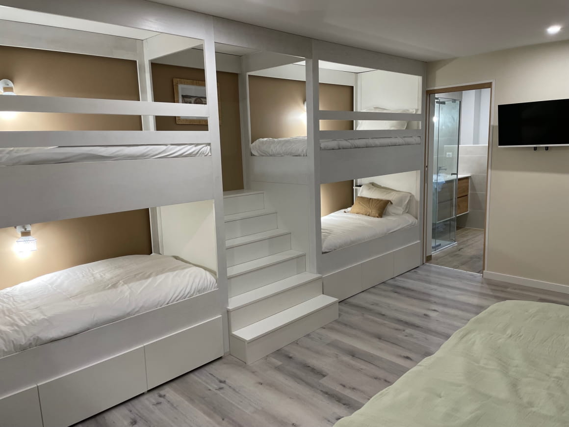 The upper floor comprises 3 bedrooms and a fully-equipped laundry room. The first bedroom has a 180×200 or 2 90×200 beds, as well as 4 90×190 beds, a shower room and toilet. The other 2 bedrooms are equipped with 160×200 beds, each with its own shower room and toilet. To guarantee optimal rest, the gîte is fitted with top-quality bedding, including top-of-the-range Epeda mattresses, comforters and hypoallergenic pillows.