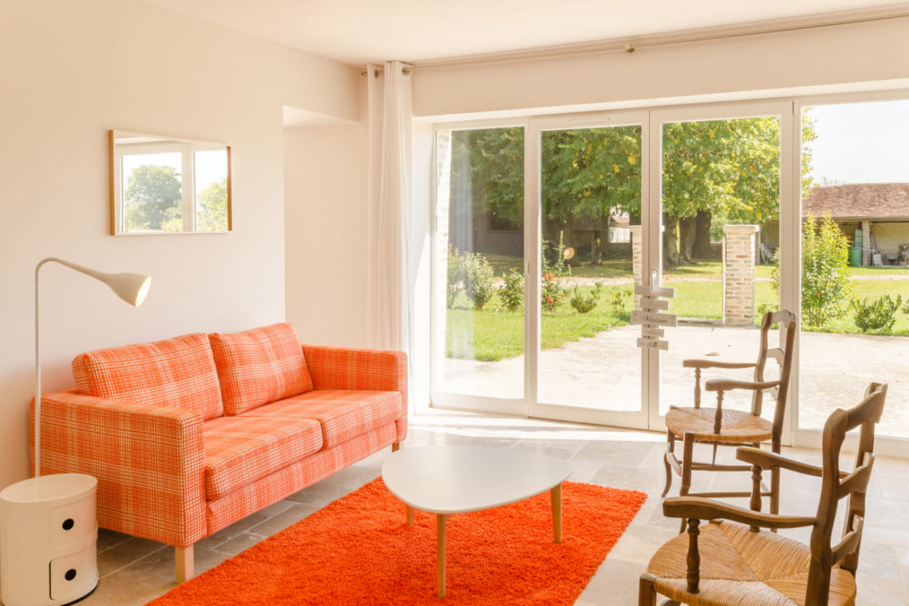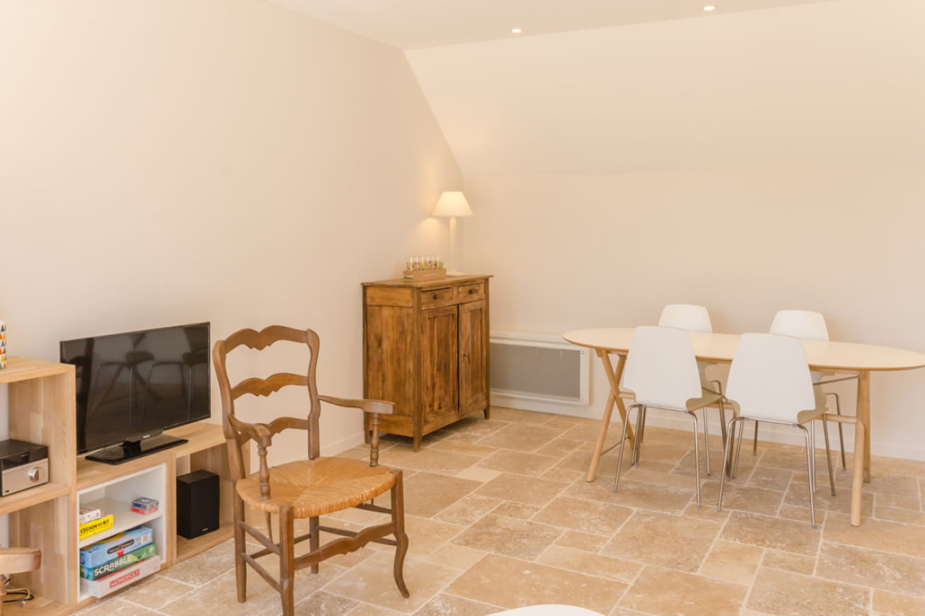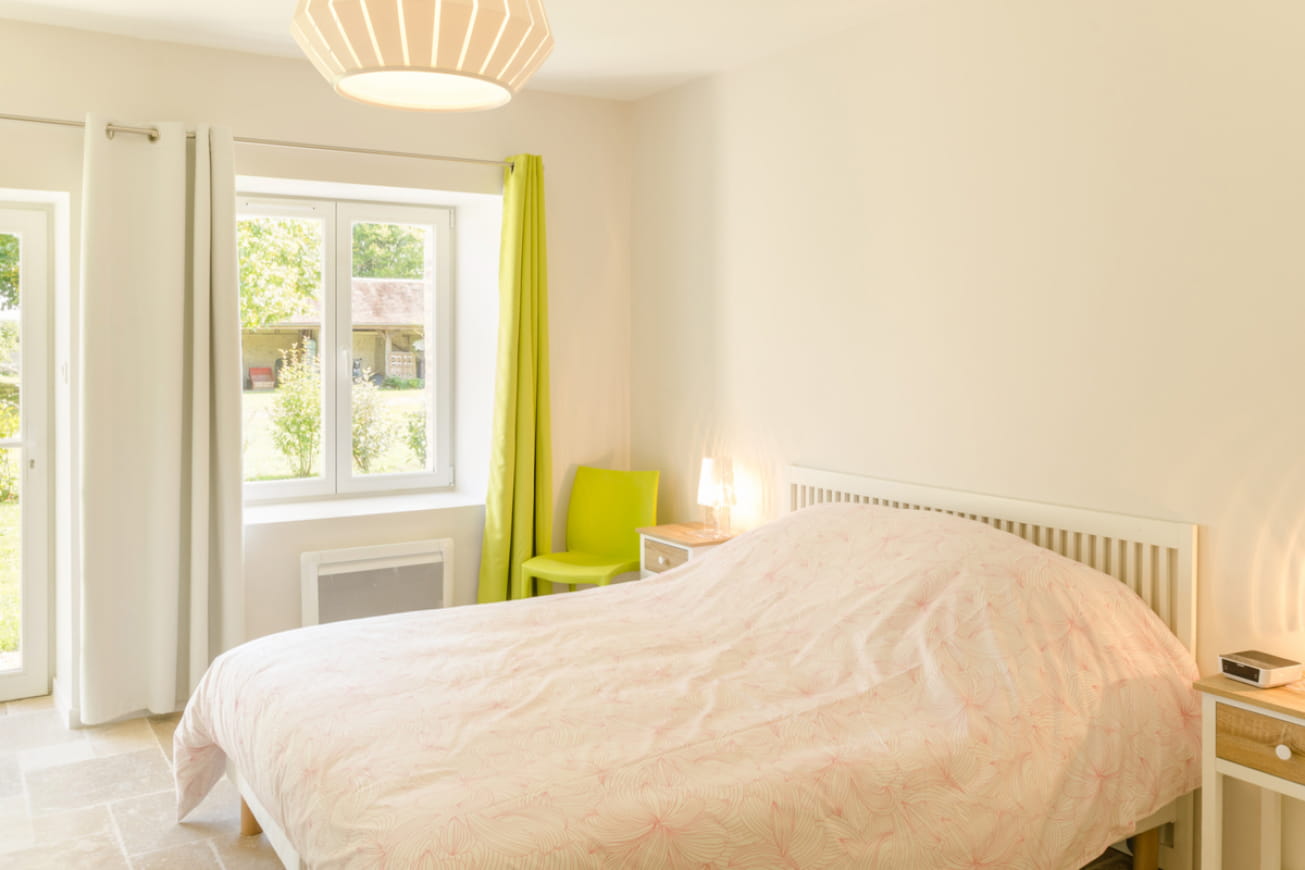 This single-storey house has been tastefully renovated to combine the old and the new. It has been fitted out in a building at the end of which the owner lives. It features a living room with contemporary dining and relaxation area, kitchen, double bedroom (1 bed 160 x 200 cm), twin bedroom (2 beds 90 x 1900 cm), shower room, wc. Possibility of renting a 3rd bedroom with a 160×200 bed and private bathroom (shower, wc) at €35/night. The gîte has been designed to provide an optimal welcome and stay for people with reduced mobility.