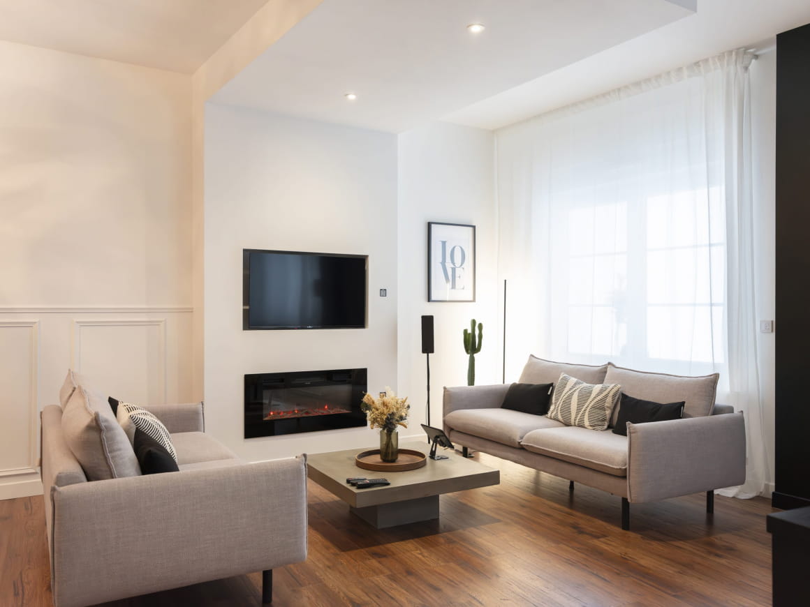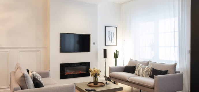 As soon as you enter, you’ll be seduced by the elegant, modern living room, complete with electric fireplace for a cosy ambience. A fully-equipped kitchen is at your disposal for a completely independent stay, with tea, coffee and sweet treats on offer. On the night side, an elegant bedroom with king-size bedding guarantees a cosy night’s sleep, complemented by a luxury en-suite bathroom. A cot is also available if required.