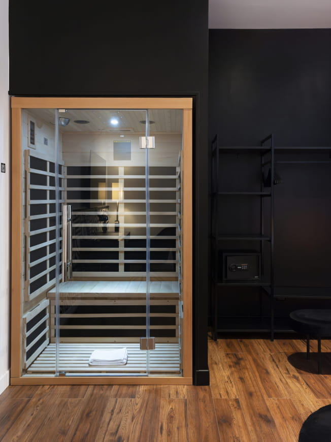 Experience absolute relaxation in a totally private wellness area: take advantage of the whirlpool bath to escape in total serenity, indulge in a private sauna session to release tension, and finally enjoy the spacious Italian shower for a feeling of freshness and comfort.