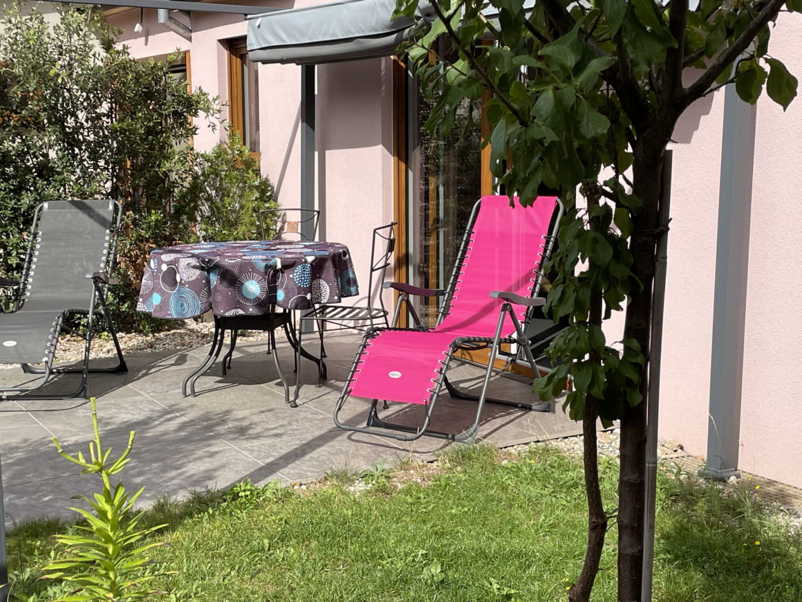 The third gîte, "COTE REMPART", sleeps 2, with its terrace and cocooning area, decorated in a mix of wood and iron.
