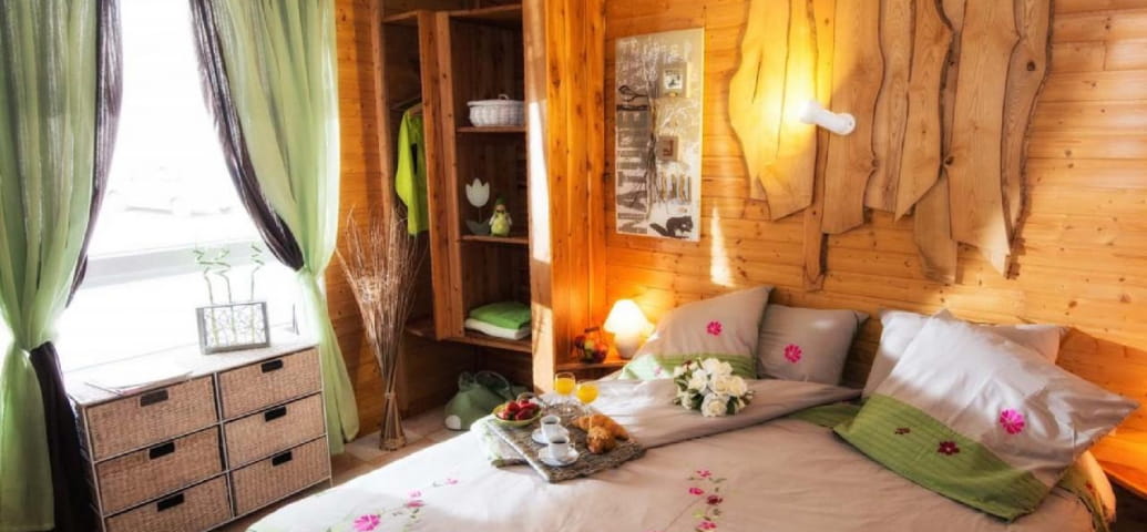 Fall under the spell of this cocooning room in the heart of the Vosges mountains. The 12 m² room has been carefully designed to make your stay as pleasant as possible. As soon as you open the doors, you'll be transported by the soft, cosy atmosphere. The rustic touch of wood warms the decor for a cozy, romantic ambience.