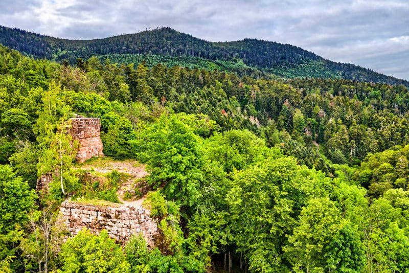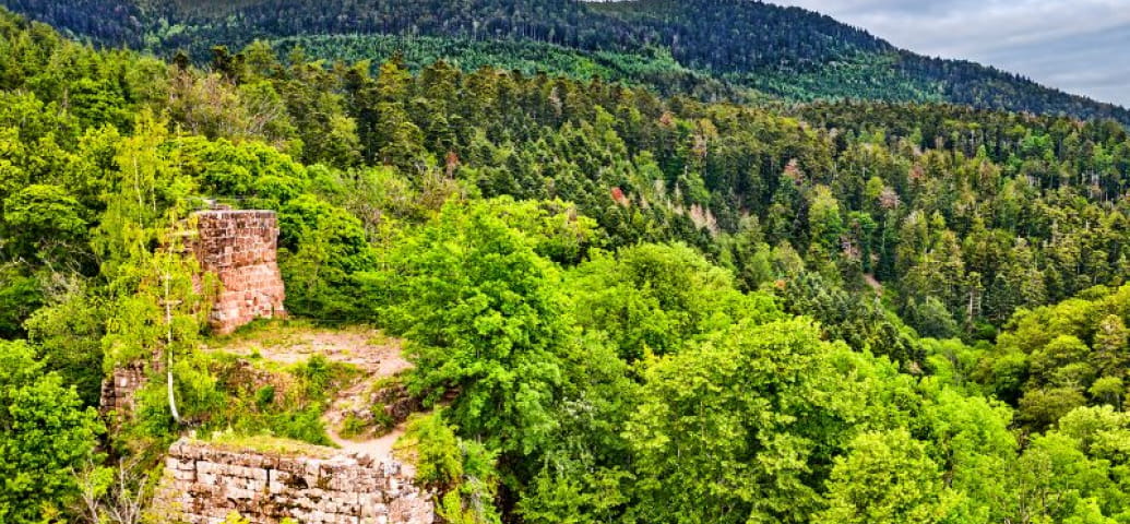 Picturesque landscapes will reveal themselves on your tour. Beyond the agricultural landscapes and vineyards, you’ll discover the Vosges forests that stretch across the entire route. From the top of Schneeberg, 961 m above sea level, you’ll enjoy an exceptional panorama of the rolling, green landscape of the Vosges mountains. Nearby, the Nideck waterfall, cascading from a wall of volcanic rock, offers an exceptional spectacle.