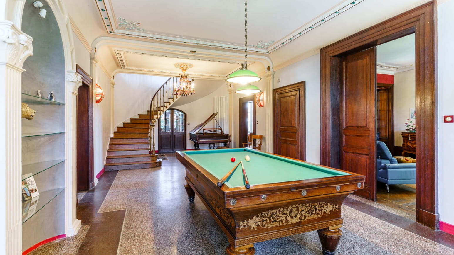 - A cinema room, a vintage French billiard table and a Playel quarter-grand piano
