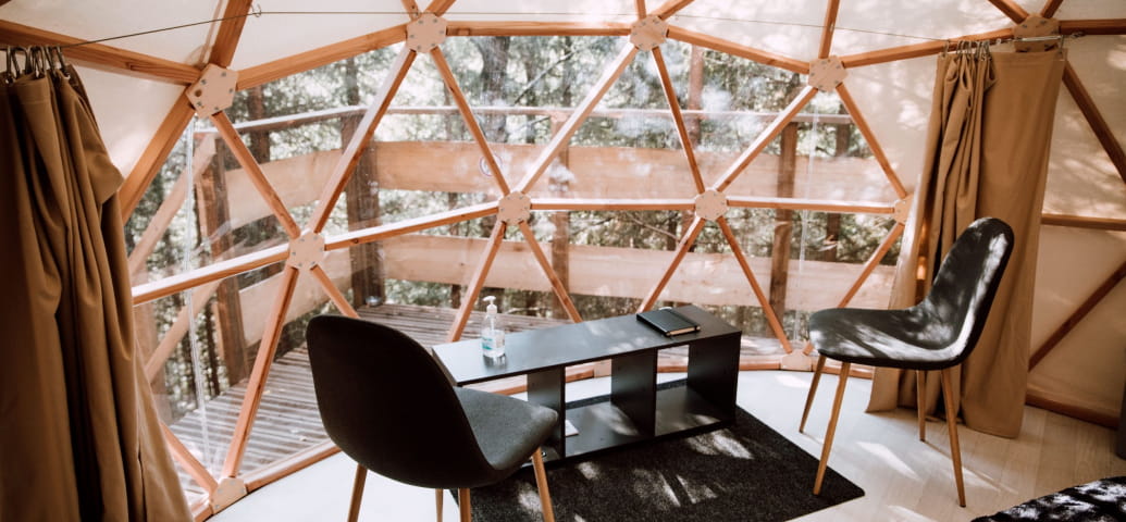 The dome has a geodesic structure. The top is entirely transparent, offering a panoramic view of the starry sky. This is the signature of the dome, named "L'Étoile". A comfortable double bed is installed under the vaulted ceiling. A cosy corner with Nordic chairs opens onto the terrace. L'Étoile also features electric heating with a fireplace effect.