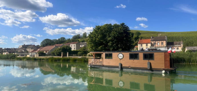 Rent an eco-designed houseboat for private wine-tourism tours of the cultural and historical heritage of the Champagne vineyards, in the historic heart of the unesco world heritage site of champagne vineyards, cellars and houses, between Epernay, Aÿ-Champagne, Reims and Châlons en Champagne.