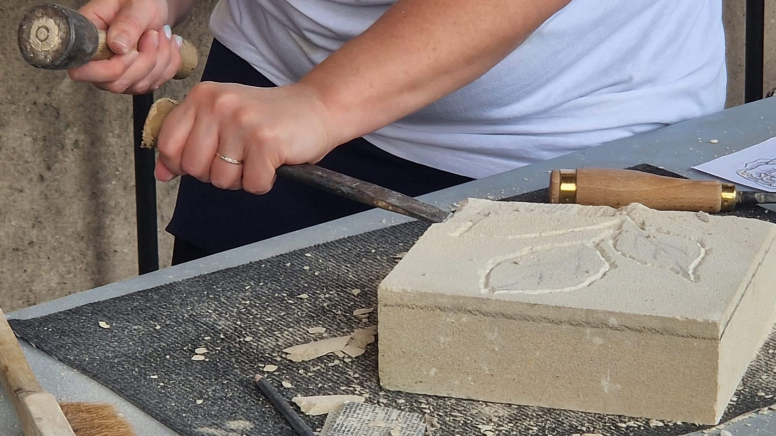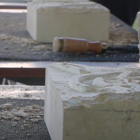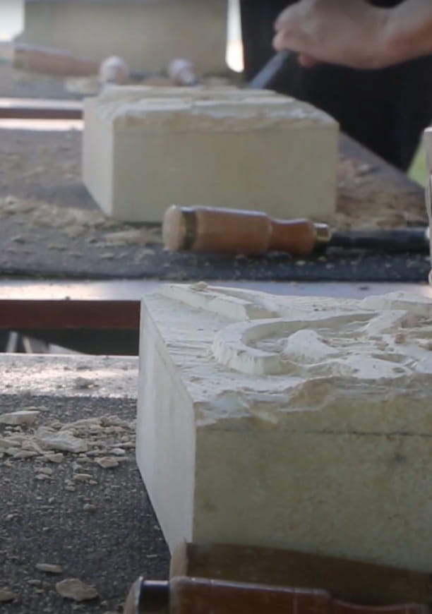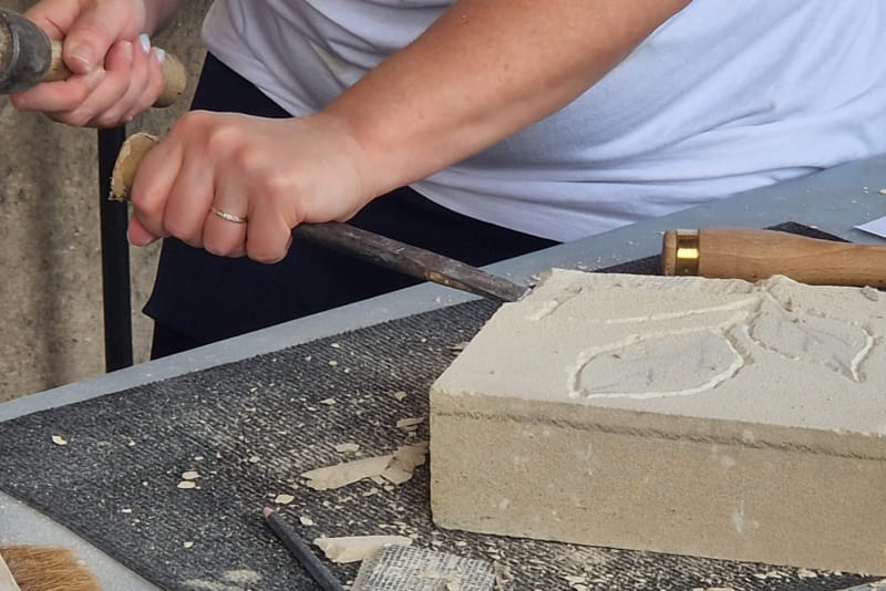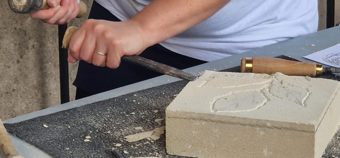 In the Galerie du Bord de l’Eau, located in the heart of the Cour d’Honneur garden, you’ll learn how to tame a rough block of local limestone. With a sledgehammer in hand, Angélique will guide you through the process of creating volume, sculpting the material to reveal the motif of your choice. To this manual step is added an artistic touch: coloring with natural pigments, inspired by ancient and medieval traditions.