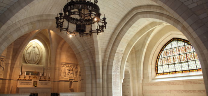 Your visit begins in the crypt, a meditative space where the names of the heroes are engraved in stone. Continue on to the ossuary, where the remains of 1,500 soldiers are laid to rest, before entering the upper chapel, bathed in light and enhanced by monumental stained-glass windows. A journey steeped in history and emotion, perfect for a complete immersion in the memories of the Great War.
