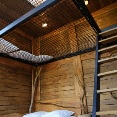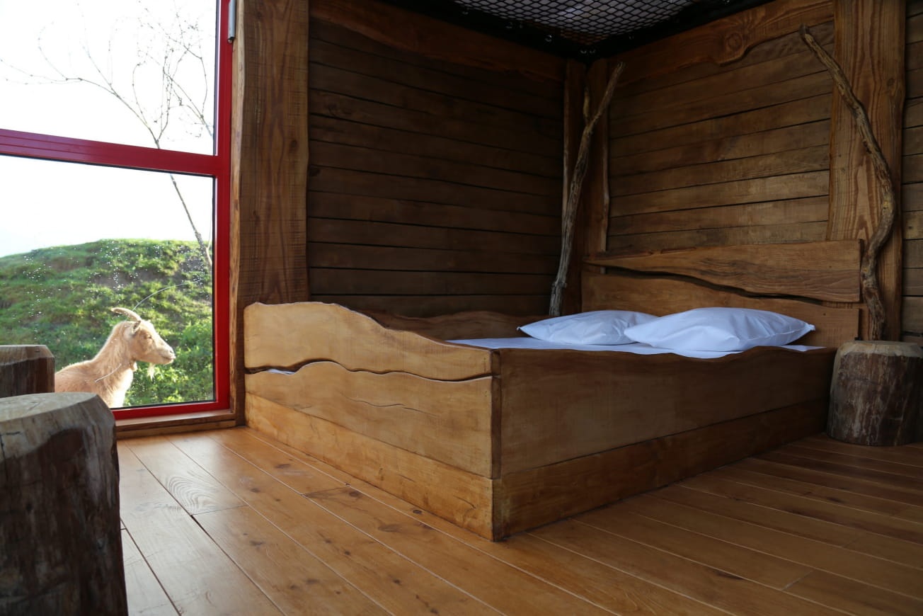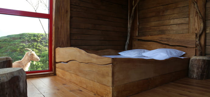Let yourself be tempted by the unsuspected comfort of this mezzanine net bed. At night, you'll be able to observe the celestial vault and the shepherd's star. Thanks to the huge bay window covering the cabin's main façade, you'll be able to contemplate the little goats grazing in this peaceful green meadow.
