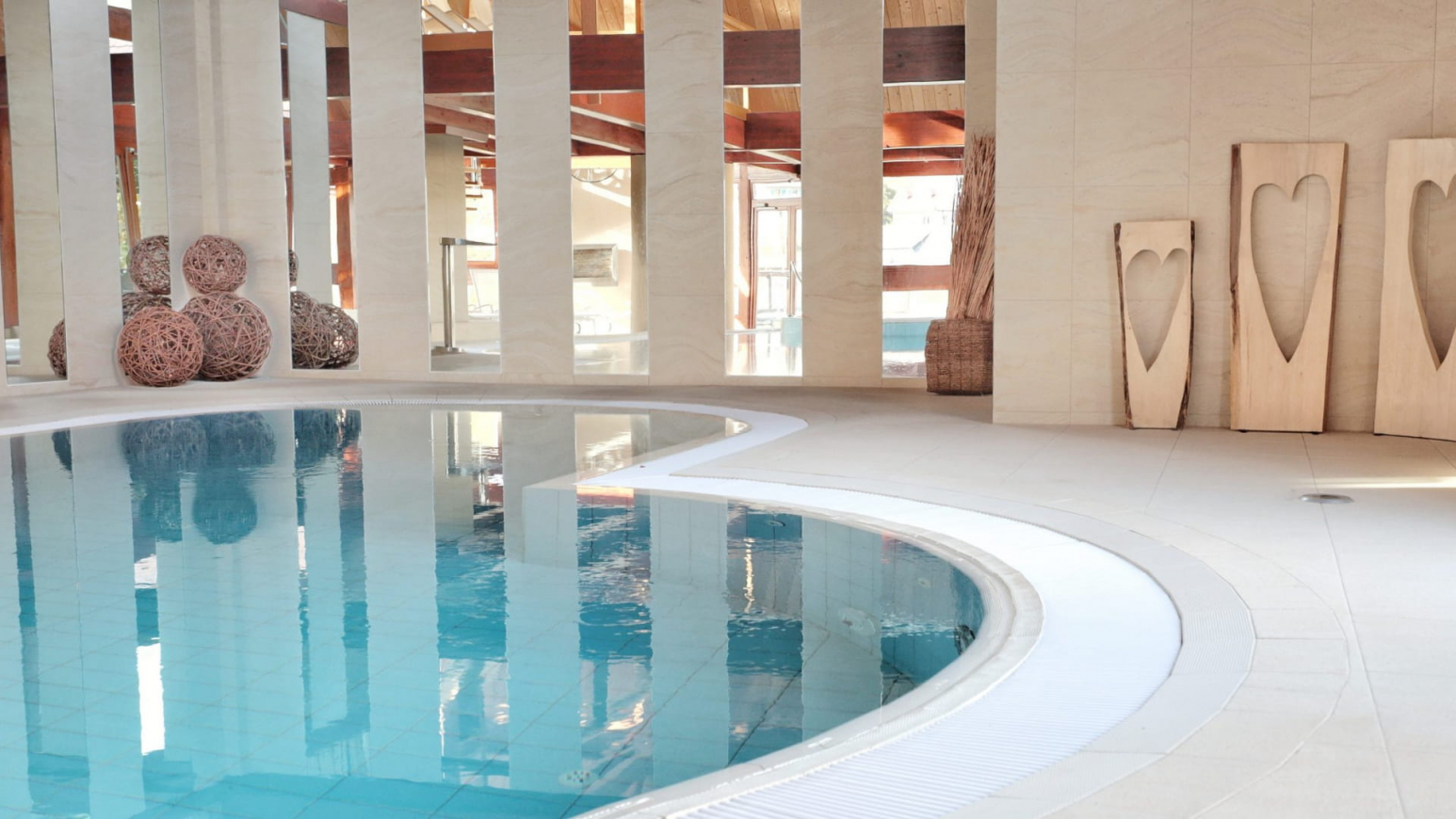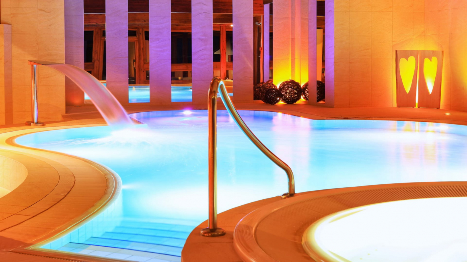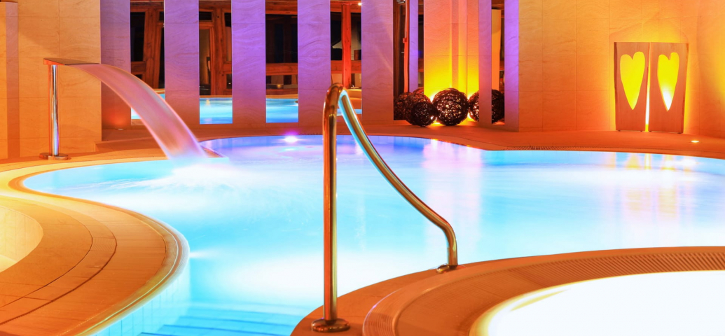 The 1,000 m² wellness area features an indoor swimming pool heated to 30°C, a 35°C Jacuzzi, a Finnish sauna, a sanarium, a hammam, a relaxation room with a hay bed, 3 individual massage rooms, a fitness room, multi-jet showers and an outdoor terrace with deckchairs and views of the mountains and meadows. The hammam and sauna facilities are textile-free.