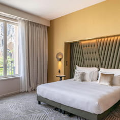 Afterwards, you'll drift off to sleep in the arms of Morpheus, in a comfortable, tastefully decorated room. The carpet patterns evoke vineyards seen from the sky, while the suspended glass light fittings are a nod to champagne bottles. And the natural colors are a tribute to the Champagne region.