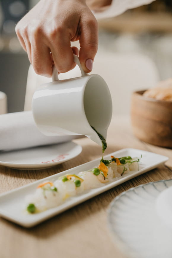 But first, make yourself comfortable in the restaurant’s spacious dining room, and soak up its gentle atmosphere. Decorated in a modern spirit, with the warm touch of a large lounge, the premises are perfect for relaxing and enjoying the moment.