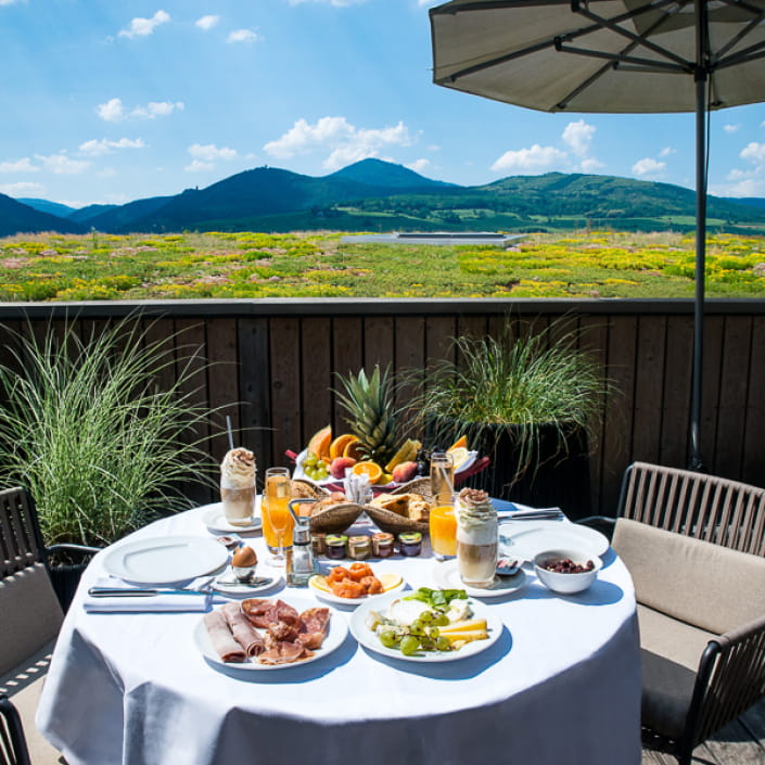 Godetevi due pranzi tête-à-tête al ristorante Le Belvédère, di fronte a una splendida vista panoramica. Componete la vostra insalata o il vostro piatto di pasta con una serie di ingredienti gustosi, per un pasto sano al 100%. La sera, recatevi all'elegante ristorante di alta gamma La Brasserie e alla sua raffinata cucina ispirata alle tradizioni alsaziane. La colazione è inclusa quando vi alzerete dal letto il mattino dopo!