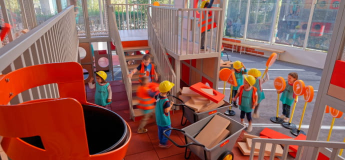Si dividono tra il Giardino (per esplorare e scoprire le piante e i piccoli animali che ci circondano, come le api), gli Esseri umani (i bambini scoprono il corpo umano), Costruisco (costruire significa imparare tecniche molto utili nella vita quotidiana), Il bosco (dove i bambini possono lavorare sul loro pensiero logico e risolvere indovinelli matematici), Gli animali (compreso il formicaio per osservare la vita di questi insetti), L'oasi (per conoscere le proprietà fisiche dei liquidi), Il vivaio (uno spazio dove i bambini possono coltivare la loro creatività) e La grotta per esplorare le proprietà della luce.