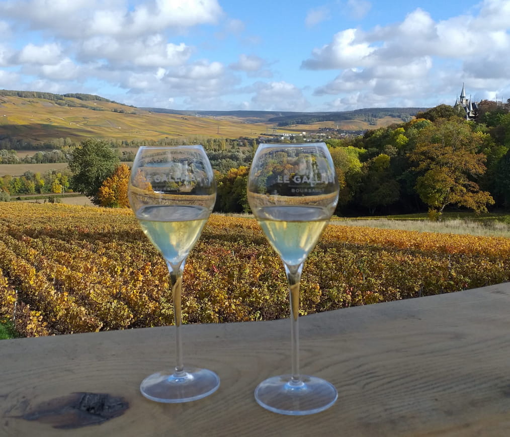 - Dégustation de sa propre bouteille sabrée sur la terrasse avec une vue panoramique sur le vignoble de la Vallée de la Marne et les tours du Château de Boursault