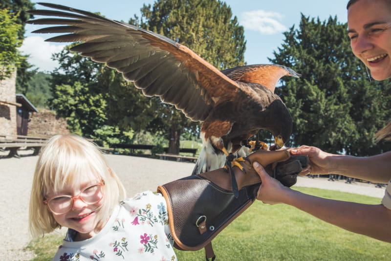 Lasciatevi avvicinare e domare dai rapaci più sorprendenti del mondo tra le rovine di un castello medievale classificato alla Volerie des Aigles!