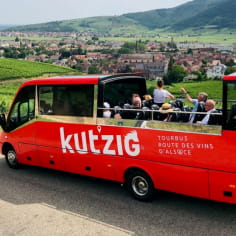 Pronti per l'avventura? Appuntamento a Colmar alle 8.30 e salita a bordo del Kut'zig. Questo autobus decappottabile, diretto verso la strada del vino, vi farà attraversare paesaggi rurali e lussureggianti, prima di fermarsi a Ribeauvillé. Da questo incantevole villaggio, salite a piedi fino a Saint Ulrich per raggiungere il più grande dei 3 castelli che dominano la città. Il viaggio di andata e ritorno dura 2 ore, ma per i più avventurosi è possibile proseguire fino a Hunawihr prima di risalire sul Kut'zig.