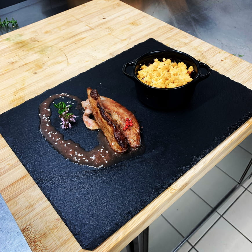 Offriamo una cena Table d’hôtes con aperitivo, menu di 3 portate, vino e bevande a 45 € a persona.