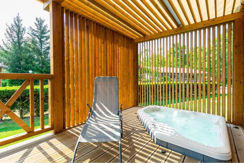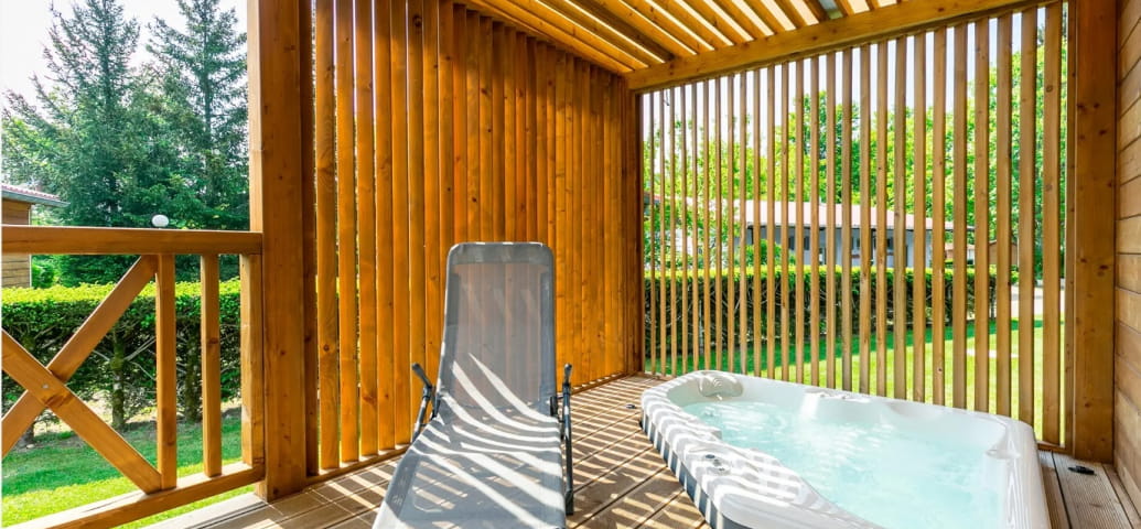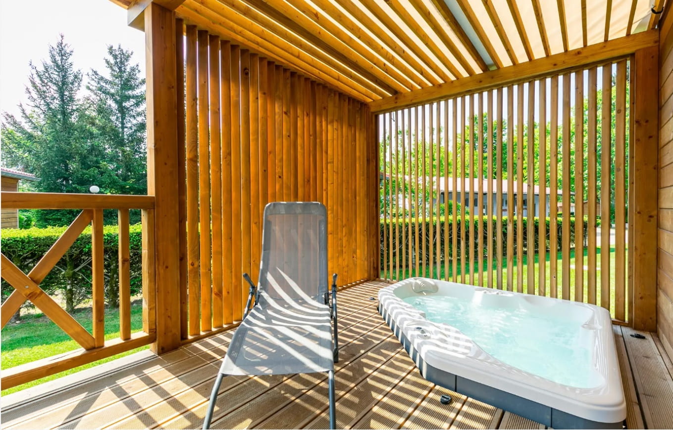Soggiornate in uno dei lussuosi chalet della struttura. Completamente attrezzati, offrono tutti i comfort necessari in alloggi di 24 m², con una vasca idromassaggio privata sulla terrazza per i vostri momenti di relax.